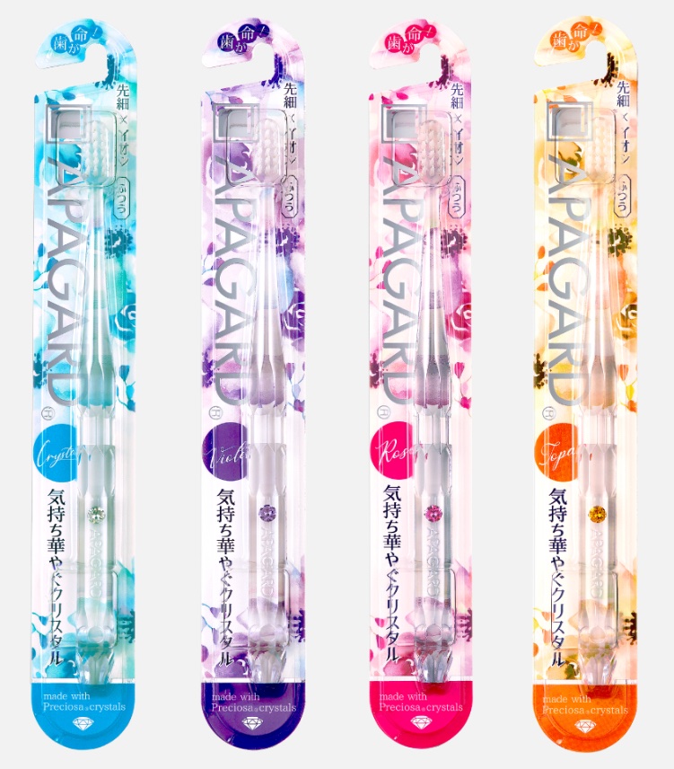 - 美しい透明ハンドルにクリスタルをあしらった歯ブラシ。3列コンパクトヘッド。独自のアパタイト毛*で、ブラッシング時にマイナスイオンを発生。気持ち華やぐクリスタル歯ブラシで着色・歯垢を落として白い歯へ。耐熱温度:60℃ *アパサイダー(抗菌剤)とトルマリンを練りこんだ先細毛 2021年3月12日 パッケージを変更して登場。 みずみずしく凛としたクリスタル、甘さと洗練さを兼ね備えたバイオレット、フェミニンな印象の華やぎローズ、ポジティブなパワー溢れるトパーズ。
