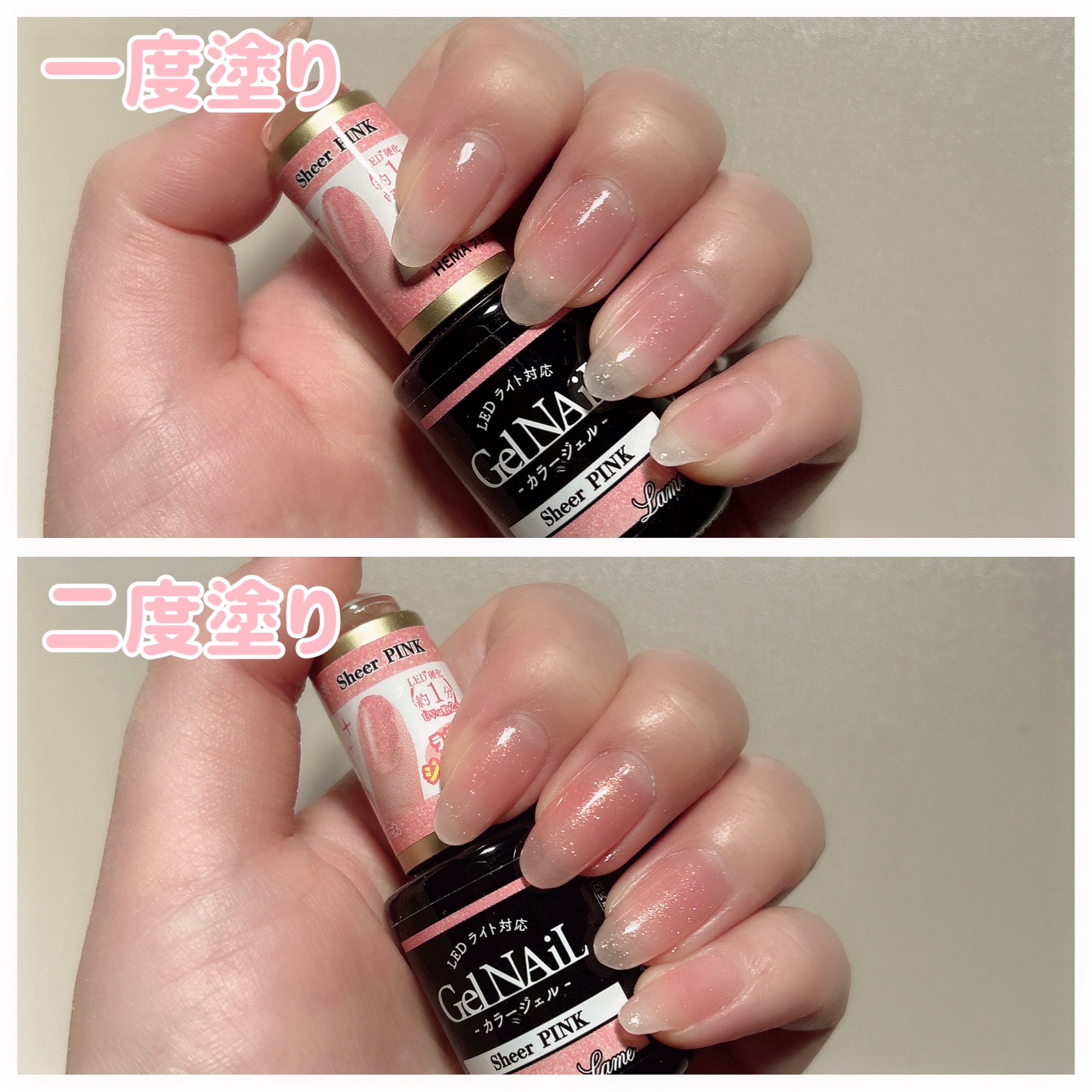 セリアのヌーディコーラルがめちゃくちゃおすすめだった..!! 透け感のあるナチュラルカラーで誰でも合いそう💗 オフィスネイルにも使えるから一度使ってみてほしい🥺 一度塗りだとうっすらピンクベージュでこのままでも可愛い! よりナチュラルが好きな人はこのままでも🫶🏻 二度塗りだとピンクが濃くなって可愛さが増す☺️💗 自爪が少し透ける感じ!ムラにもなりにくくて初心者さんにもおすすめ!ちゅるん感もあって絶妙に可愛い🧡