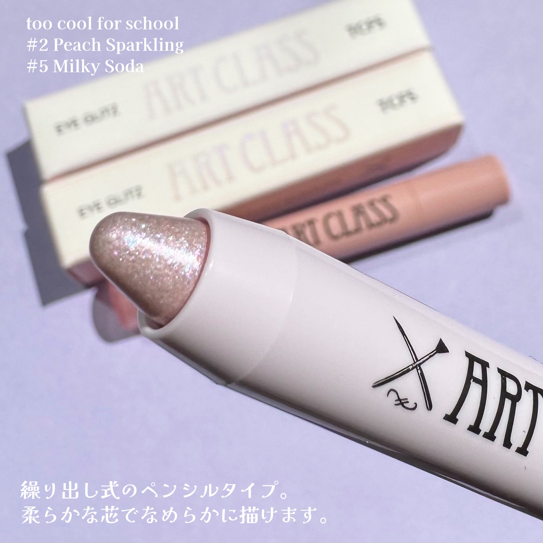 アートクラス アイグリッツ2PEACHSPARCLING自然な感じのピーチコーラルグリッター5MILKYSODA神秘的なブルーパールが加わったホワイトパープルグリッター手のひらサイズのかわいいキラキラペンシル。柔らかで、描きごこちもなめらか!...