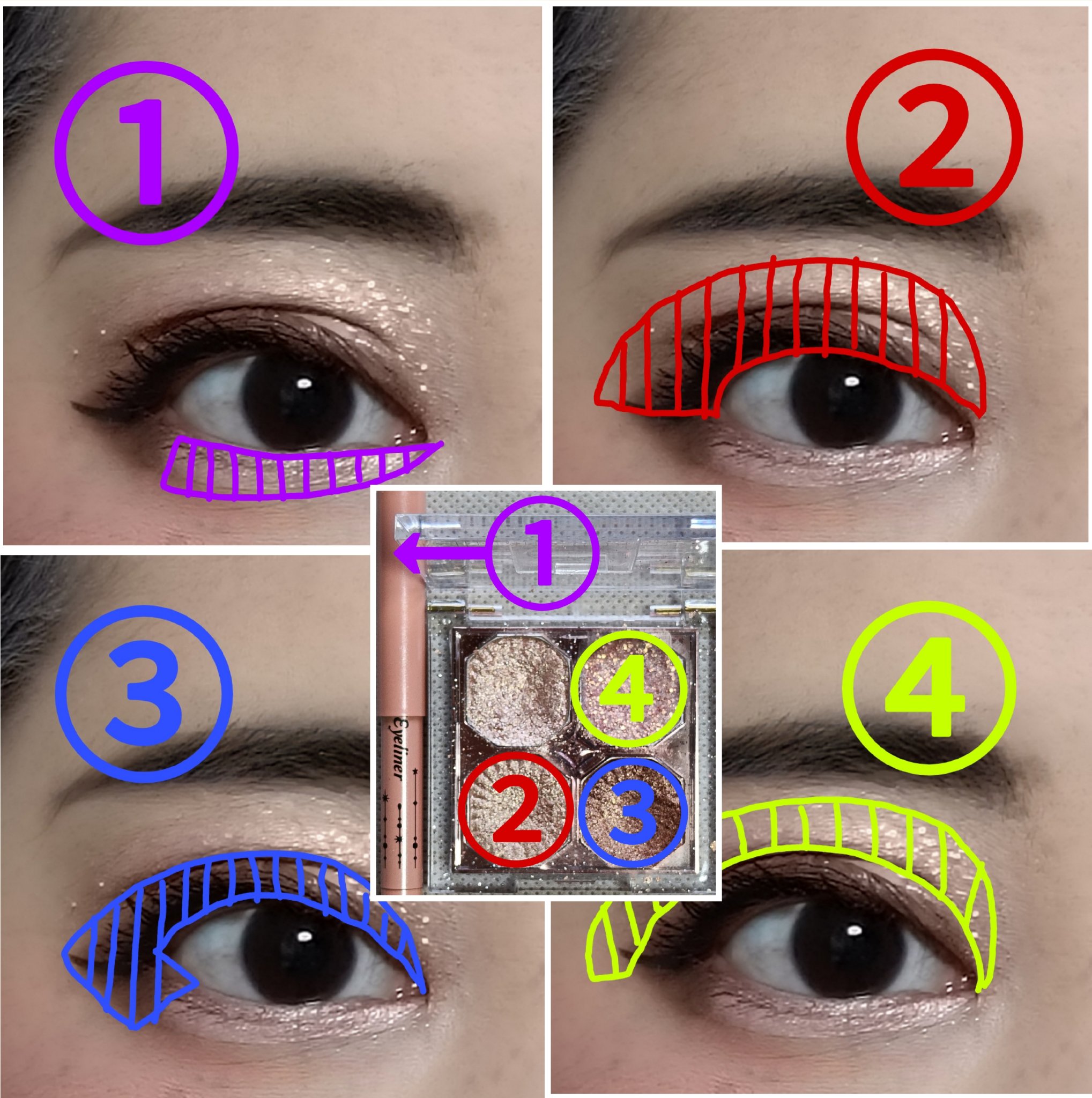 アイシャドウパレットは、URGLAM UR GLAMBLOOMING EYE COLOR PALETTE 02を、使用しました。 マスカラは、MAYBELLINE NEW YORK コロッサルボリュームエクスプレスを、まつ毛全体にまんべんなく塗ります。 リップは、wet 'n' wild MegaLast Lip Colorを、唇全体にまんべんなく塗ります。
