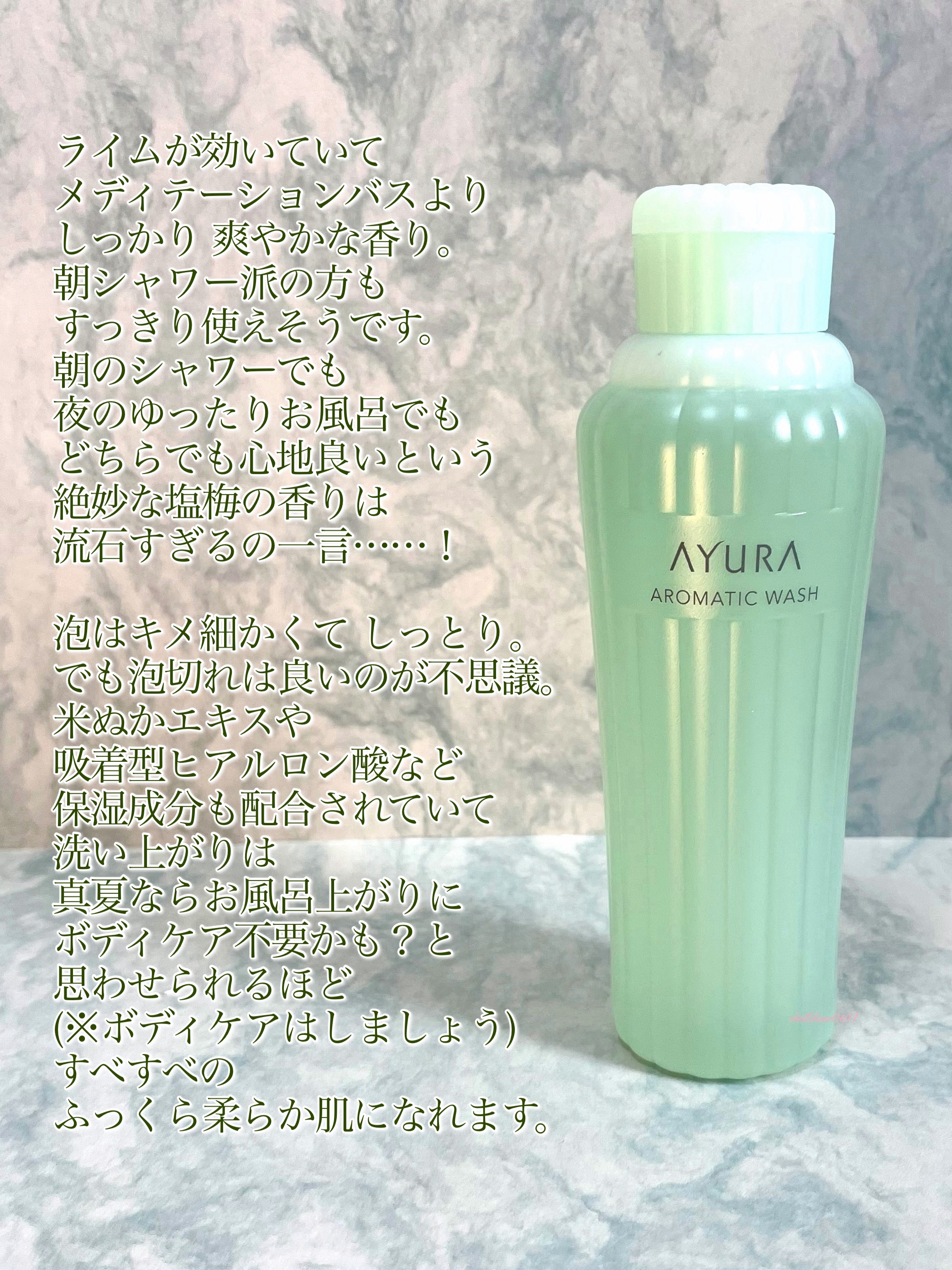 疲れた夜には…🌙アユーラのボディウォッシュ🫧ゆっくりお風呂タイムしたい夜に、使っています。【アユーラ アロマティックウォッシュα】とにかくいい香り!アロマティックハーブに、ライムやベルガモットなどがブレンドされた爽やかな香り…🌿少量でたっぷり...