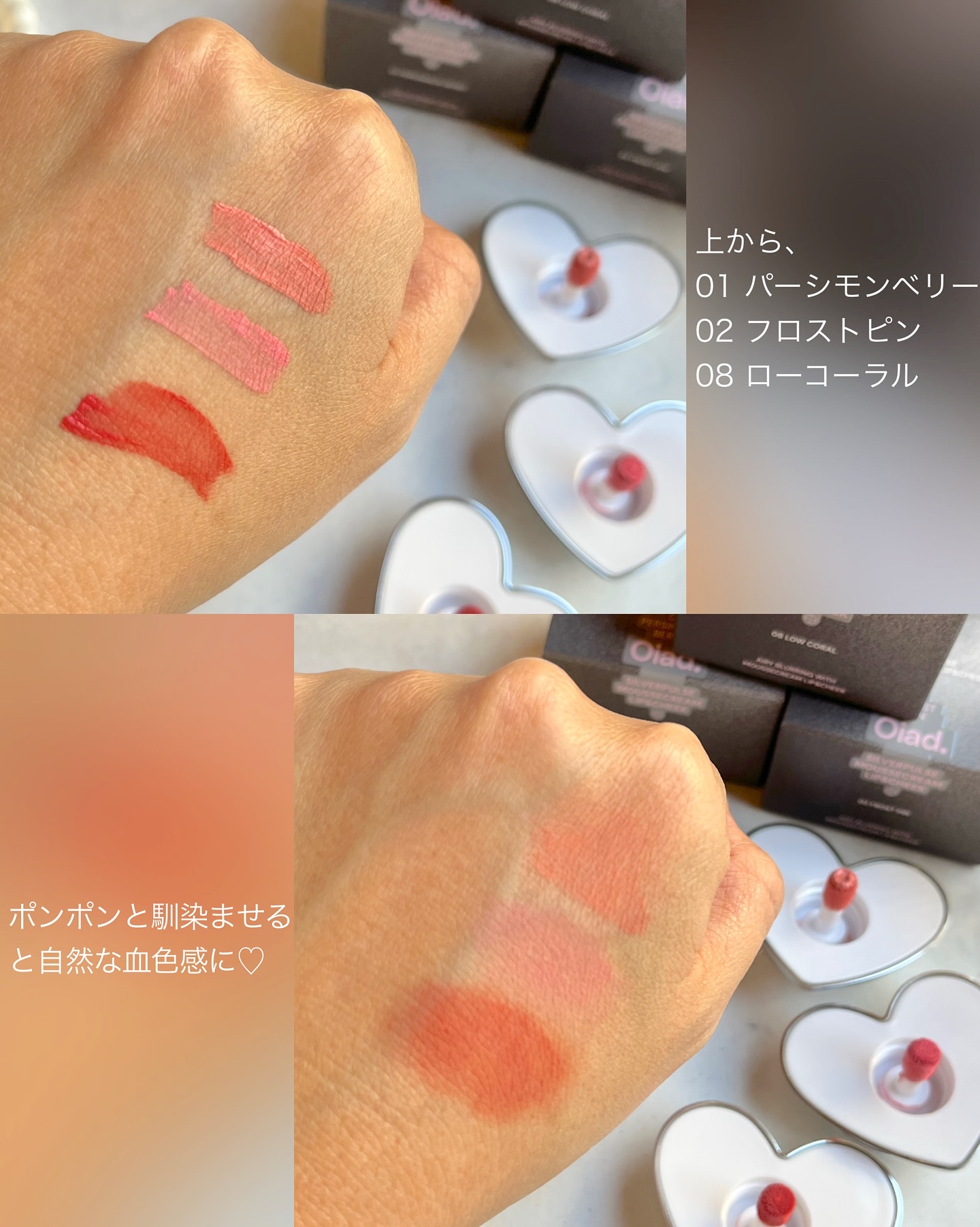 Oiad様より商品提供をいただきました!Oiadシルバーパースムースクリームリップ&チーク(01,02,05)¥2,600(Qoo10)✼••┈┈••✼••┈┈••✼••┈┈••✼••┈┈••✼✅毛穴の凹凸を埋めるプライマーミックスブラッシャ...