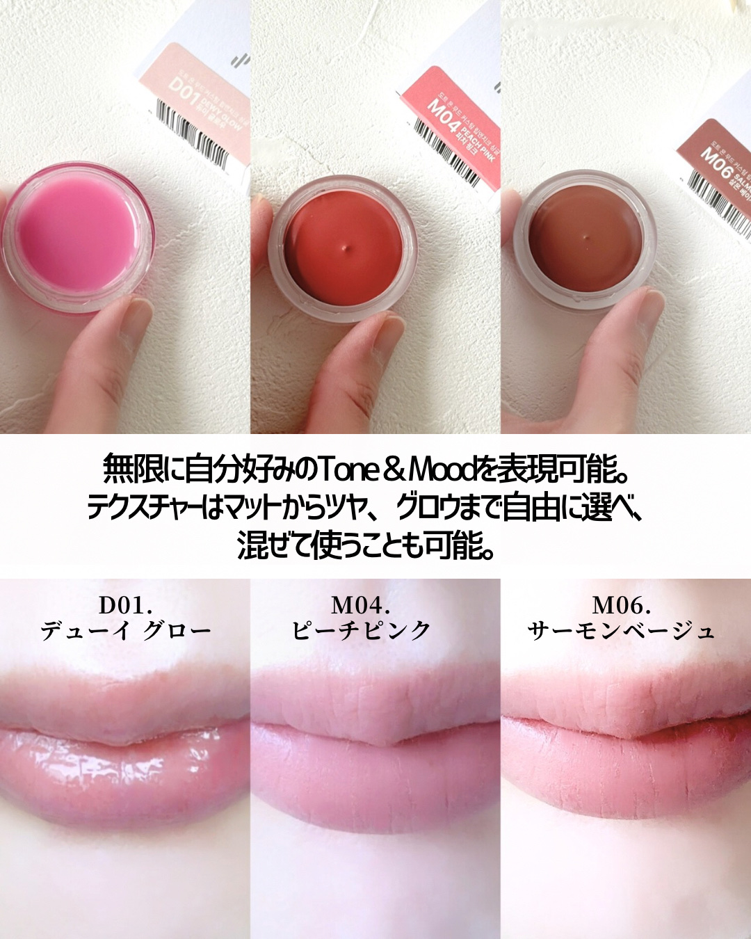 - <D01 デューイグロー> オクチルドデカノール、ジイソステアリルマレート、ビス-ベヘニル/イソステアリル/フィトステリルジメリノール酸ジメリノレイン酸、エチルセルロース、マイクロクリスタリンワックス、合成ワックス、フェノキシエタノール、カプリリルグリコール、シメチコン、エチルヘキシルグリセリン、香料、酸化チタン、赤色202号、精製水、赤色104号(1)、1,2-ヘキサンジオール、ヒアルロン酸ナトリウム、加水分解ヒアルロン酸トリモニウム、アセチル化ヒアルロン酸ナトリウム、加水分解ヒアルロン酸、ヒアルロン酸、加水分解ヒアルロン酸ナトリウム、ヒアルロン酸ナトリウムクロスポリマー、ヒアルロン酸カリウム <H01 トーンアップバーム> カプリル酸/カプリン酸トリグリセリド、オクチルドデカノール、マイカ、ポリグリセリル-2トリイソステアリン酸、ビスジグリセリルポリアシルアジペート-2、酸化チタン、シリカ、C13-15アルカン、合成ワックス、ポリグリセリル-3ポリリシノレイン酸、VP/ヘキサデセンコポリマー、マイクロクリスタリンワックス、合成ミツロウ、ソルビタンイソステアレート、ジステアリルジモニウムヘクトライト、カプリル酸/カプリン酸グリセリズ、カプリリルグリコール、ステアリン酸、香料、BHT <M01 コーラル> イメティコン、ダイメチコンクロスポリマー、トリベヘニン、ビニールダイメティコン/メティコンシルセスキオクセインクロスポリマー、ダイアイソステアリルマレート、ポリグリセリル-2トライアイソステアレート、セティルピージ/ピーピージ-10/1ダイメティコン、トリメチルシロキシシリケート、ポリグリセリル-4アイソステアレート、ココ-カプリレート/カプリレート、1,2-ヘキサンジオール、アイソドデケイン、ポリグリセリル-3ポリリシノリエート、チタンジオキシド、ダイステアーダエモニウムヘクトライト、黄色4号、ソルビタンアイソステアレート、赤色104(1)、ポリヒドロキシステアリックアシッド、シリカシリレート、黄色5号、赤色202号、レシチン、イソプロピルミリステイト、アイソステアリックアシッド、エチルヘキシルパルミテート、香料、ペンタエリスリチルテトラ-ダイ-t-ブチルヒドロキシヒドロキシシンナメート、黒色酸化鉄 <M02 ロージコーラル> ダイメティコン、ダイメチコンクロスポリマー、トリベヘニン、ビニールダイメティコン/メティコンシルセスキオクセインクロスポリマー、ダイアイソステアリルマレート、ポリグリセリル-2トライアイソステアレート、セティルピージ/ピーピージ-10/1ダイメティコン、トリメチルシロキシシリケート、ポリグリセリル-4アイソステアレート、ココ-カプリレート/カプリレート、1,2-ヘキサンジオール、チタンジオキシド、アイソドデケイン、ポリグリセリル-3ポリリシノリエート、ダイステアーダエモニウムヘクトライト、黄色5号、ソルビタンアイソステアレート、ポリヒドロキシステアリックアシッド、黄色4号、シリカシリレート、赤色202号、レシチン、赤色酸化鉄、イソプロピルミリステイト、アイソステアリックアシッド、エチルヘキシルパルミテート、香料、黒色酸化鉄、ペンタエリスリチルテトラ-ダイ-t-ブチルヒドロキシヒドロキシシンナメート、黄色酸化鉄、青色1号 <M03 フォグピンク> ダイメティコン、ダイメチコンクロスポリマー、トリベヘニン、ビニールダイメティコン/メティコンシルセスキオクセインクロスポリマー、ダイアイソステアリルマレート、ポリグリセリル-2トライアイソステアレート、セティルピージ/ピーピージ-10/1ダイメティコン、トリメチルシロキシシリケート、ポリグリセリル-4アイソステアレート、チタンジオキシド、ココ-カプリレート/カプリレート、1,2-ヘキサンジオール、アイソドデケイン、ポリグリセリル-3ポリリシノリエート、ダイステアーダエモニウムヘクトライト、ソルビタンアイソステアレート、ポリヒドロキシステアリックアシッド、黄色5号、シリカシリレート、赤色202号、レシチン、イソプロピルミリステイト、アイソステアリックアシッド、エチルヘキシルパルミテート、香料、黒色酸化鉄、ペンタエリスリチルテトラ-ダイ-t-ブチルヒドロキシヒドロキシシンナメート、赤色104号(1)、黄色4号、青色1号 <M04 ピーチピンク> ダイメティコン、ダイメチコンクロスポリマー、トリベヘニン、ビニールダイメティコン/メティコンシルセスキオクセインクロスポリマー、ダイアイソステアリルマレート、ポリグリセリル-2トライアイソステアレート、セティルピージ/ピーピージ-10/1ダイメティコン、トリメチルシロキシシリケート、ポリグリセリル-4アイソステアレート、ココ-カプリレート/カプリレート、チタンジオキシド、1,2-ヘキサンジオール、アイソドデケイン、ポリグリセリル-3ポリリシノリエート、ダイステアーダエモニウムヘクトライト、ソルビタンアイソステアレート、黄色5号、ポリヒドロキシステアリックアシッド、シリカシリレート、