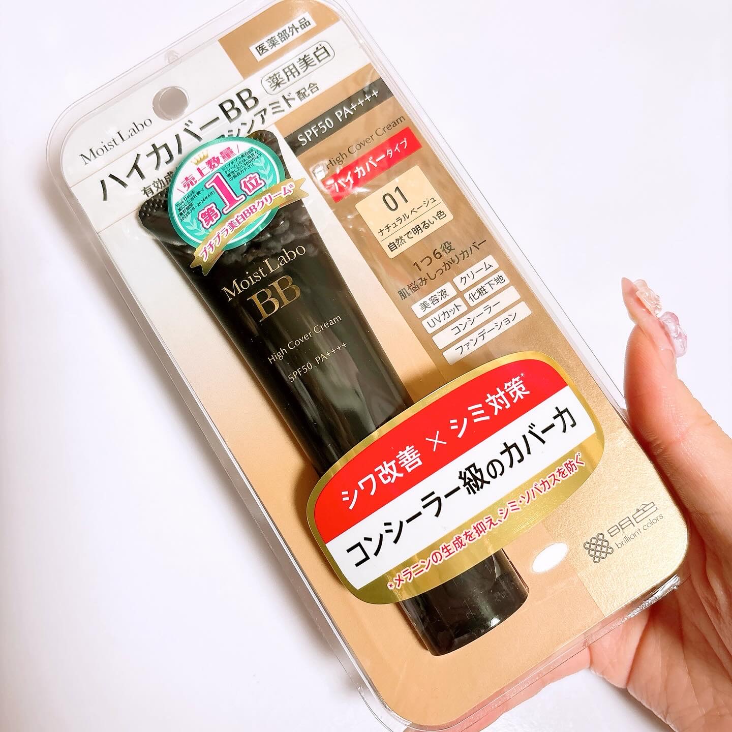 - 【医薬部外品】 「モイストラボ ハイカバー薬用美白BBクリーム」は薄付きなのにコンシーラー級のカバー力でしっかりとシミなどの肌悩みを隠しながら、同時にナイアシンアミド配合でつけている間中シワを改善し、美白対策もできる画期的なBBクリームです。 当社独自のモイスチャーマグネットHC配合でうるおい成分が密着し続け、リペアプロテクトCR配合でバリア効果も発揮。 1本6役(美容液・クリーム・UVカット・化粧下地・コンシーラー・ファンデーション)なので時短メイクなのに美しい仕上がりが叶います。 汗・水に強いウォータープルーフタイプでSPF50・PA++++なので春夏のメイクにも最適です。 〇薄膜で均一に仕上がり、厚塗り感なくシミ・くすみ・毛穴をしっかりカバー 〇密着カバーしながら、シワ改善と美白が同時に叶う 〇サラッとセミマット肌で崩れにくい 〇美白ケアしながらうるおう 〇コンシーラーいらずで1本でベースメイク完了 〇1本で6つの効果(美容液・クリーム・UVカット・化粧下地・コンシーラー・ファンデーション) 〇肌を守るバリア効果 〇汗・水に強いウォータープルーフタイプ 〇SPF50 PA++++