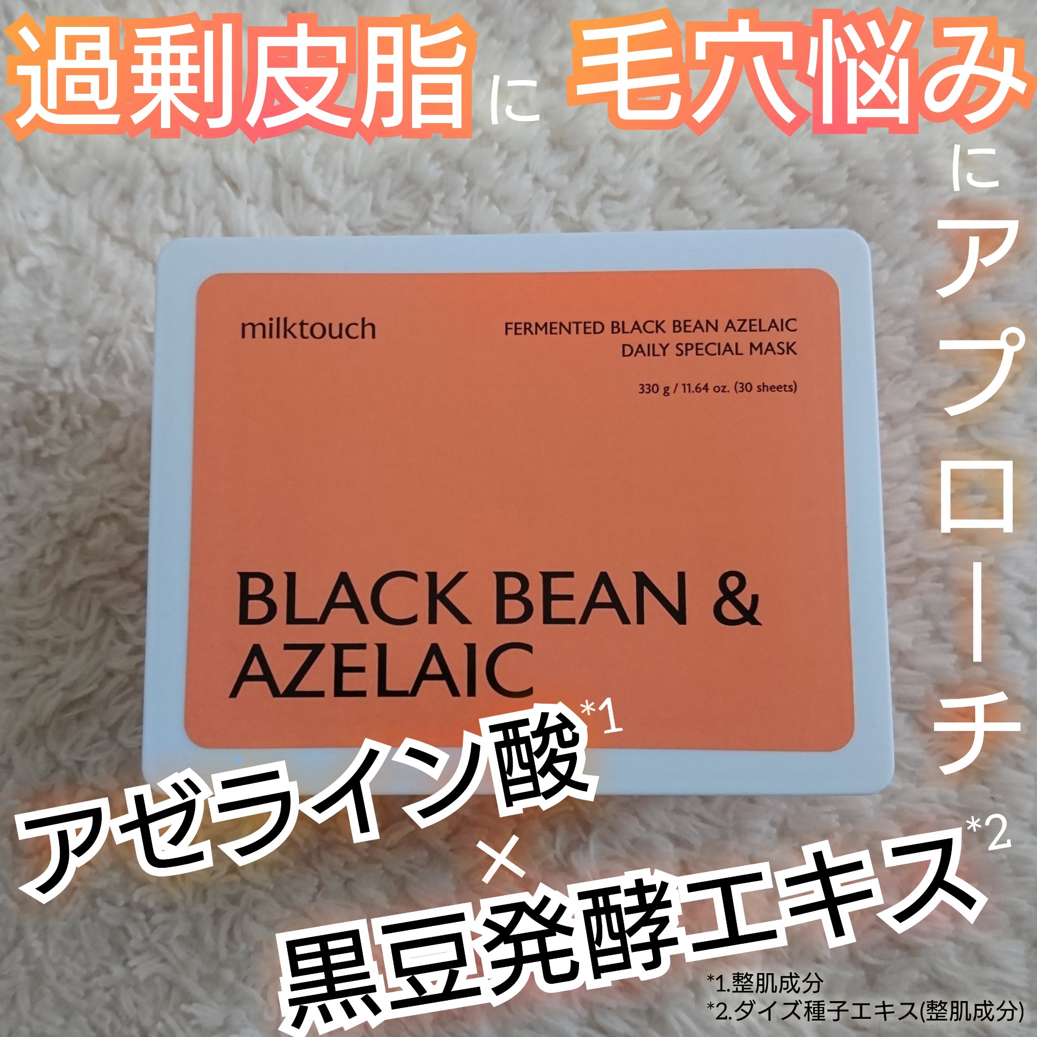 - 【日本限定】 1:“皮脂ケア成分”として注目のアゼライン酸*1が繰り返す毛穴悩みにアプローチ アゼライン酸*1は、皮脂による肌のベタつきを防ぐサポートや肌のなめらかさをサポート、肌荒れ予防などに働きかける話題の成分。 皮脂の過剰分泌による毛穴目立ちにアプローチして、毎日のケアでなめらかな肌印象に導きます。 ミルクタッチは、デイリーマスクにたっぷりとアゼライン酸を配合し、毛穴の目立ちにくいイキイキとした肌印象に近づけます。 2:韓国伝統の甕器(かめき)発酵で「黒い宝石」と呼ばれる黒豆を発酵 韓国のチェジュ島は自然豊かな火山島。 ミネラルなどの栄養分をたっぷりと含んだ土壌で育った黒豆は「黒い宝石」と呼ばれています。 黒豆と発酵酵母を持つサッカロミセス*4で発酵させて生み出された黒豆発酵エキス*2は、肌にふっくらとしたうるおいを与えて、乾燥による毛穴目立ちをケアします。 3:ナイアシンアミド*1が毛穴ケア*3も潤いに満ちた透明感も、乾燥によるあらゆる肌悩みに 肌荒れの予防や乾燥くすみのケア、バリア機能のサポート、肌にハリを与えるサポートなど美容成分界のマルチプレイヤー、ナイアシンアミド*1も配合。毛穴目立ち*3のほかさまざまな乾燥による肌悩みに働きかけ美肌をサポートします。 4:低刺激処方*5&こだわりの純テンセルシートを採用 毎日使っていただきたく、低刺激処方*5に。 また、エッセンスをたっぷり含有する吸収性の高いユーカリ木由来の純テンセルシートを採用。 肌当たりがなめらかで、肌に優しい使い心地が特徴です。 *1整肌成分 *2ダイズ種子エキス(整肌成分) *3乾燥による *4シゾサッカロミセス発酵液(整肌成分) *5すべての人に皮ふ刺激が起きないわけではありません