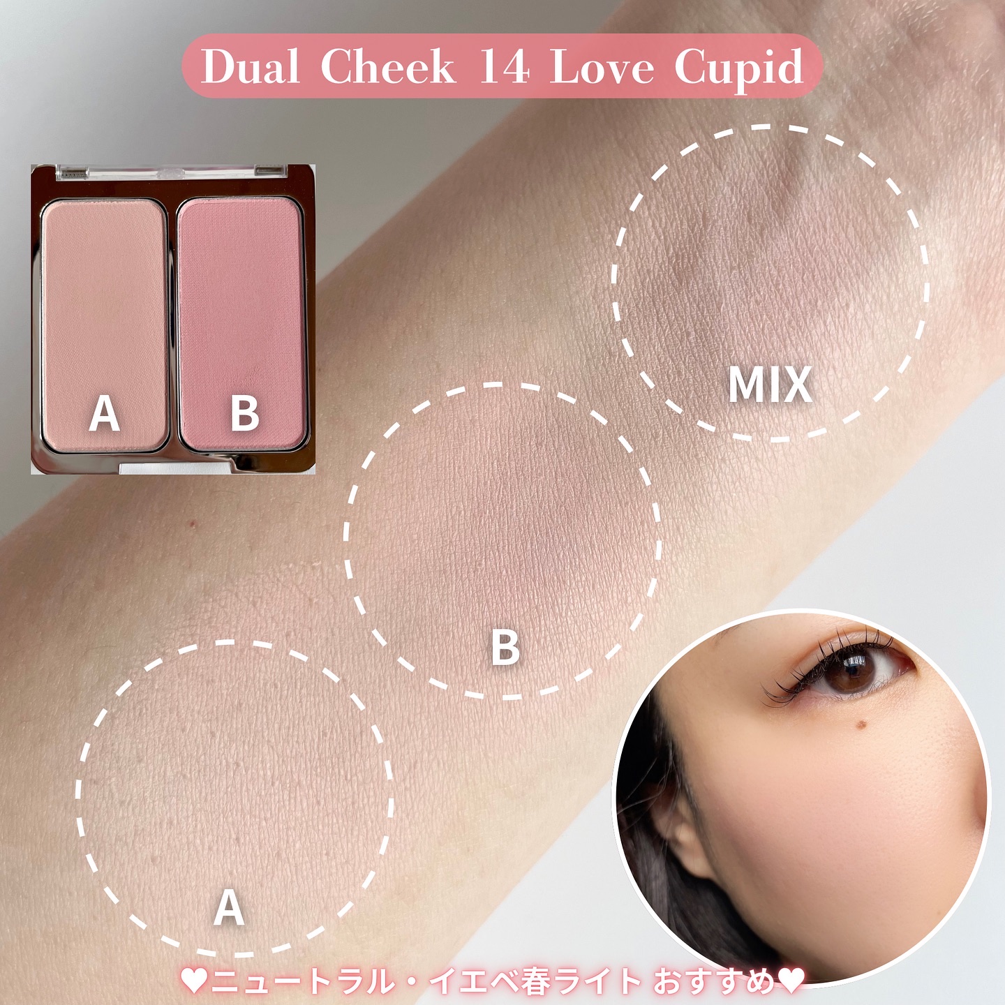 アイシャドウには各色に番号が刻印されているので、 番号順にまぶたにアイシャドウを乗せていくだけで 簡単にグラデーションが完成♡ 柔らかくしっとりした粉質なのでまぶたにぴったり密着して、粉飛びやラメ落ちしにくいのもポイント◎ チークはアイシャドウの色にあわせたカラーなので メイクに統一感を持たせてくれて嬉しいですね♡