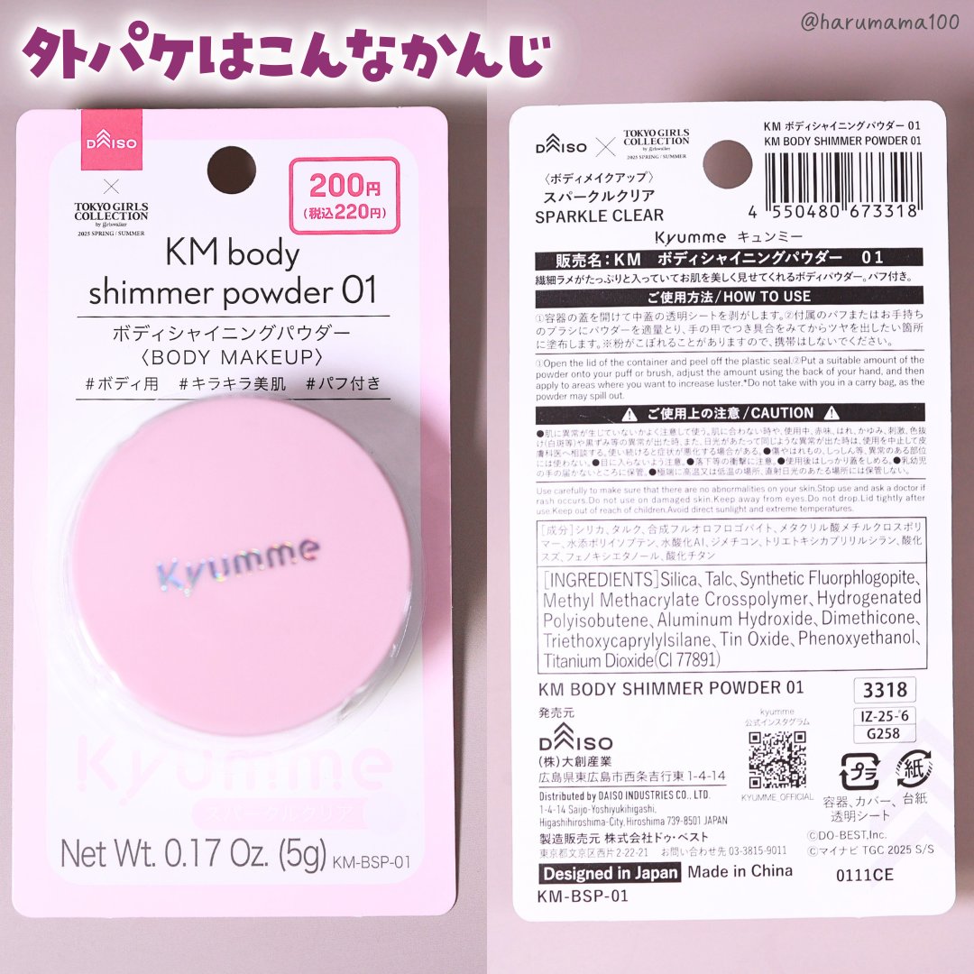 DAISOKMボディシャイニングパウダー01スパークルクリアTGCコラボ商品。このコラボ商品のパケが全部ピンクで可愛いよね~持ってるだけでテンション上がるわ!ボディ用。キラキラ美肌。200円でボディパウダーが手に入るなんて~繊細ラメがタップリ...