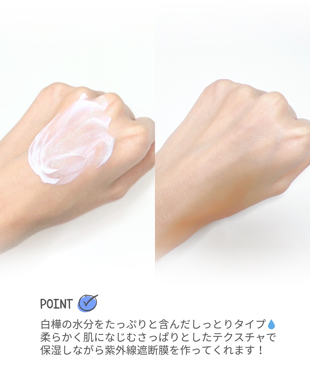 - <白樺水分uvクリーム> 水、アジピン酸ジブチル、プロパンジオール、ジエチルアミノヒドロキシベンゾイル安息香酸ヘキシル、ポリメチルシルセスキオキサン、エチルヘキシルトリアゾン、ナイアシンアミド、メチレンビスベンゾトリアゾリルテトラメチルブチルフェノール、(カプリル酸/カプリン酸)ヤシアルキル、カプリリルメチコン、イスコトリジノール、グリセリン、1,2-ヘキサンジオール、BG、シラカンバ樹液(1425ppm)、ヒアルロン酸Na、ヒアルロン酸、グリセリルグルコシド、グリチルリチン酸2K、アラントイン、スベリヒユエキス、ホソバニンジンエキス、セイヨウアカマツ葉油、ローマカミツレ花油、(アクリレーツ/アクリル酸アルキル(C10-30))クロスポリマー、ステアロイルグルタミン酸Na、ポリアクリレートクロスポリマー-6、エチルヘキシルグリセリン、アスコルビン酸、アデノシン、ペンチレングリコール、ベヘニルアルコール、ポリアクリル酸アルキル(C10-30)、ジステアリン酸ポリグリセリル-3メチルグルコース、デシルグルコシド、トロメタミン、キサンタンガム、t-ブタノール、トコフェロール、カルボマー