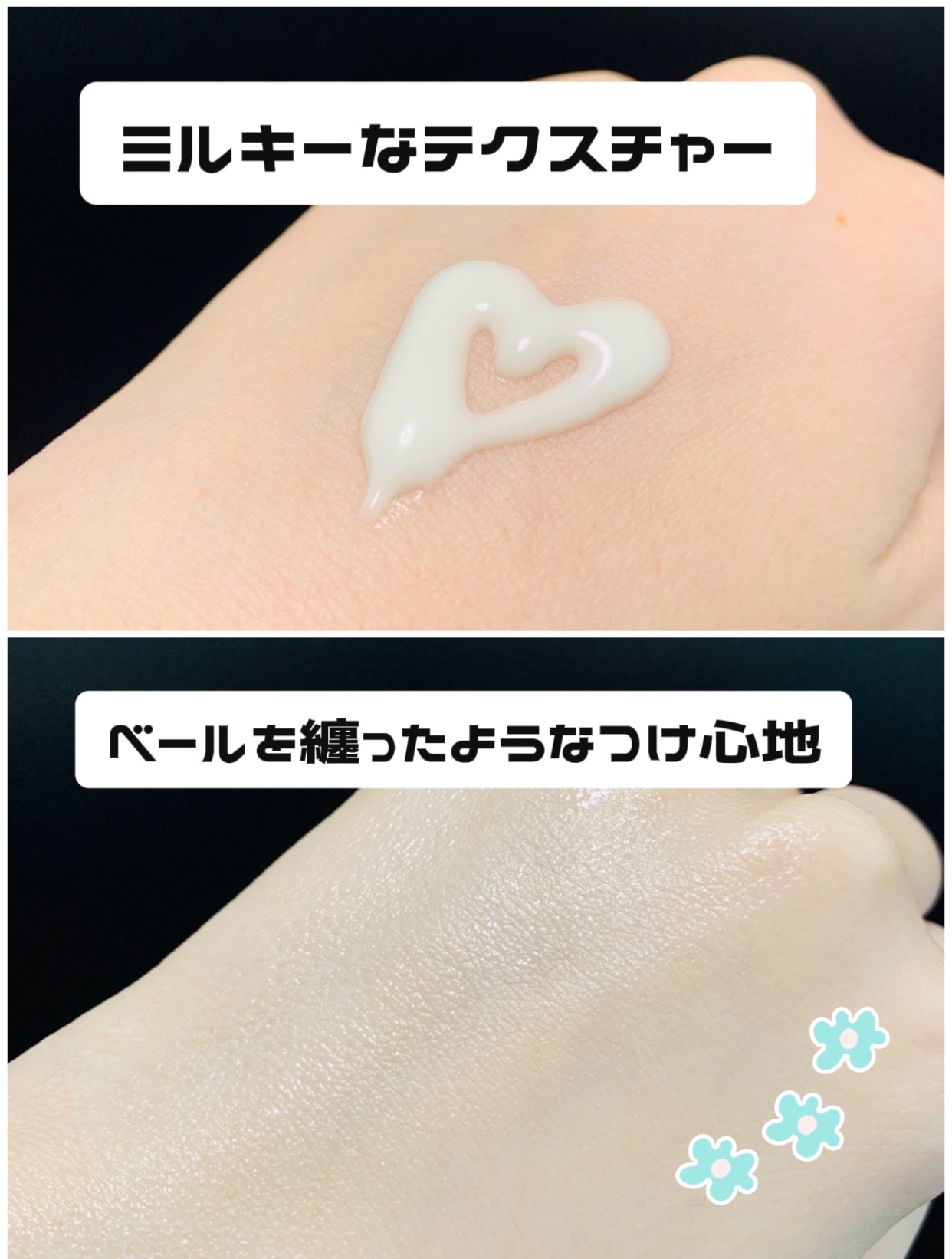 Tゾーンのテカリが気になる混合肌と くすみや色むらが悩みの私にはピッタリ🥰 しかも乳液仕様だから 化粧水の後、すぐ使えるの❣️ 美容成分がたっぷり入っているみたいで 軽いつけ心地なのに しっとりとするような使用感なのです🫧 単品利用なら石鹸で落ちるから ファンデを使わない休日にも便利だね😆 ちなみに蓋がね、ハートなの💛 めちゃくちゃ可愛い╰(*´︶`*)╯♡