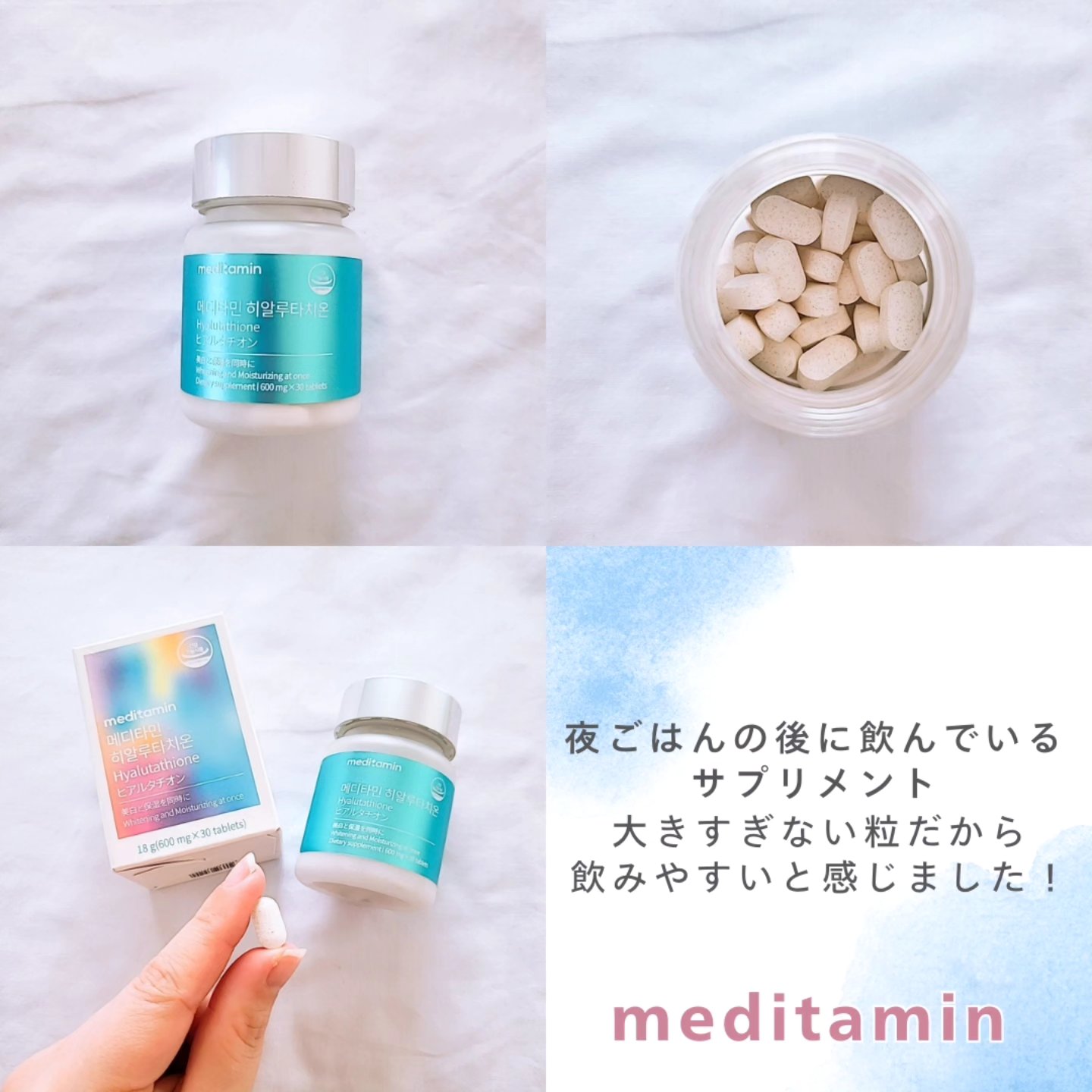 ヒアルタチオンを飲み始めてみた✨美肌をサポートする、タブレットタイプのサプリメント!水色で光沢のあるラベルの容器が印象的!オーロラカラーの箱のデザインも可愛い🩷内容量は30粒で、1日1粒を水やぬるま湯と一緒に飲めばOK◎タブレットのサイズは大...