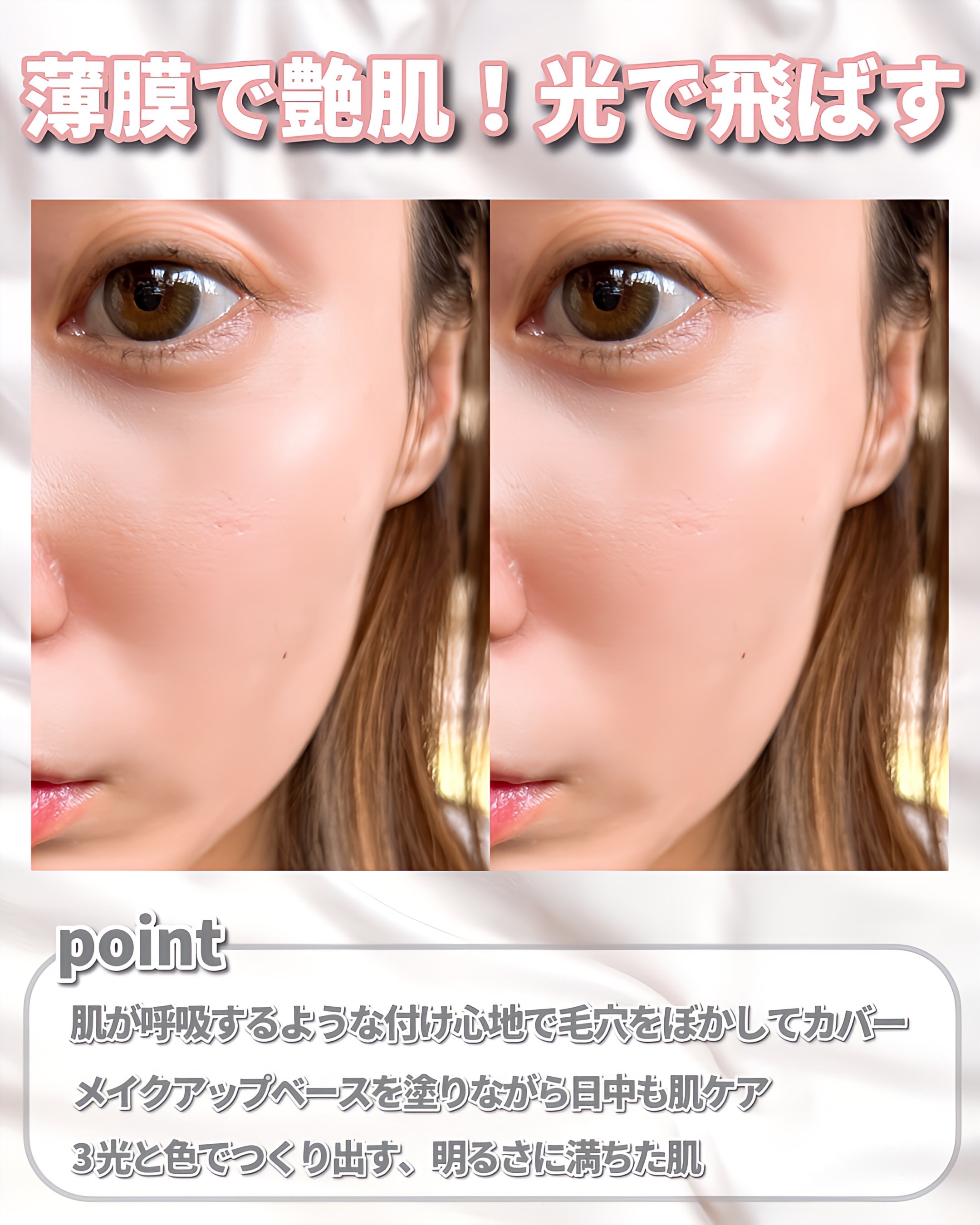 | テクスチャーはスーッと伸びて塗りやすい、乾燥もせず、匂いは無臭!日焼け対策も◎ | 詳細を見る |