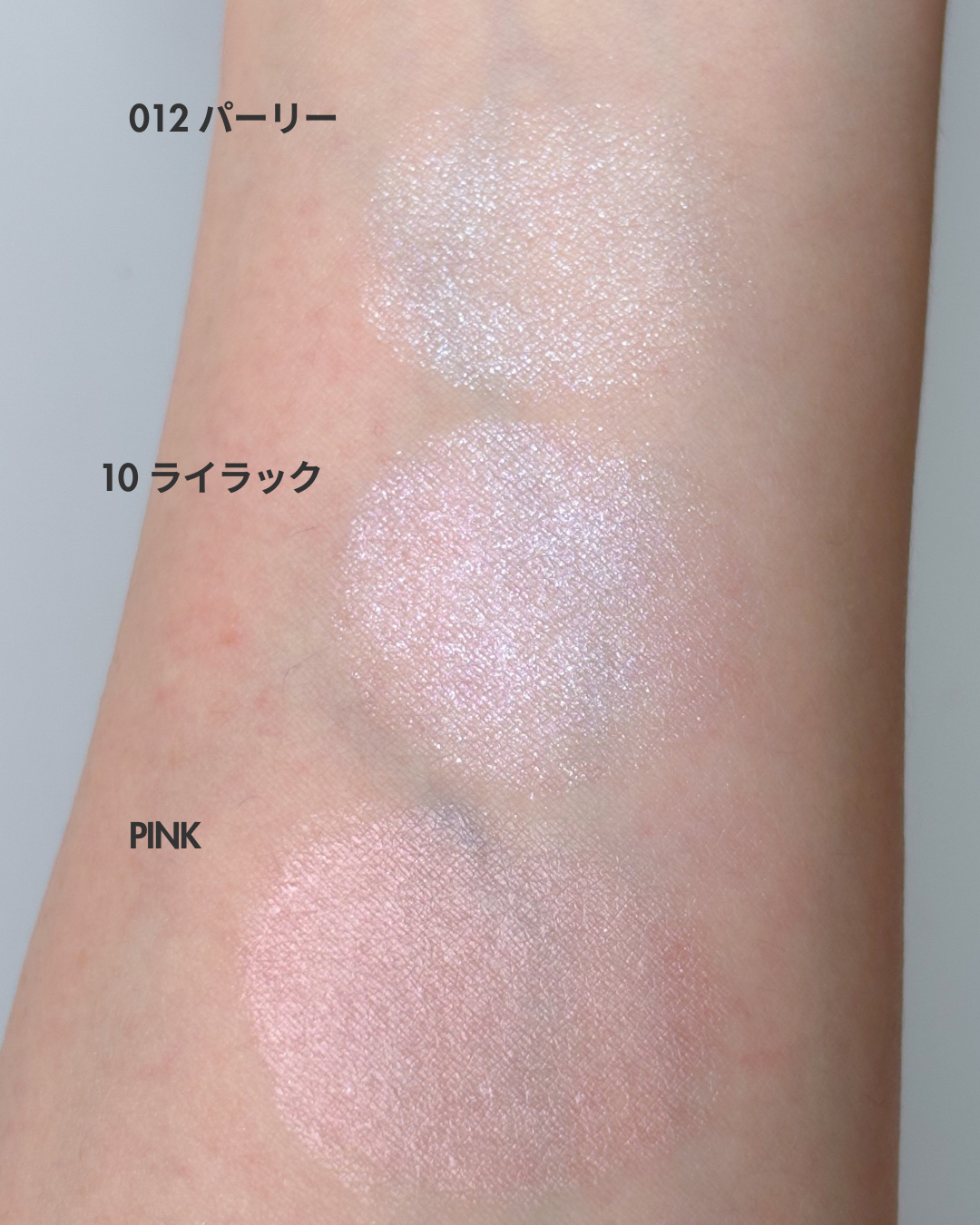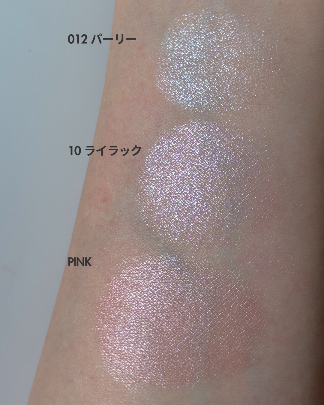 ⭐︎パーフェクトダイアリーシルバーパールキラキラ!!ひと塗りでしっかり付く✨ ⭐︎Diorプルーパールでキラキラ✨こちらも粉質良くてひと塗りでしっかり付く!写真で見ると1番キラキラに見えました。大きいパールと小さいパールのどちらもある感じでさすがDior👏 ⭐︎fwee粉が硬めで付きが他に比べて弱く感じました💦パールがシルバー系で見た目はパーフェクトダイアリーに似ていたので個人的にはこれよりもパーフェクトダイアリーの方がおすすめ! MACこれは細かいパールぎっしりの面で光る感じ✨パープルっぽく光るのでピンク系のメイクと合いそう♡