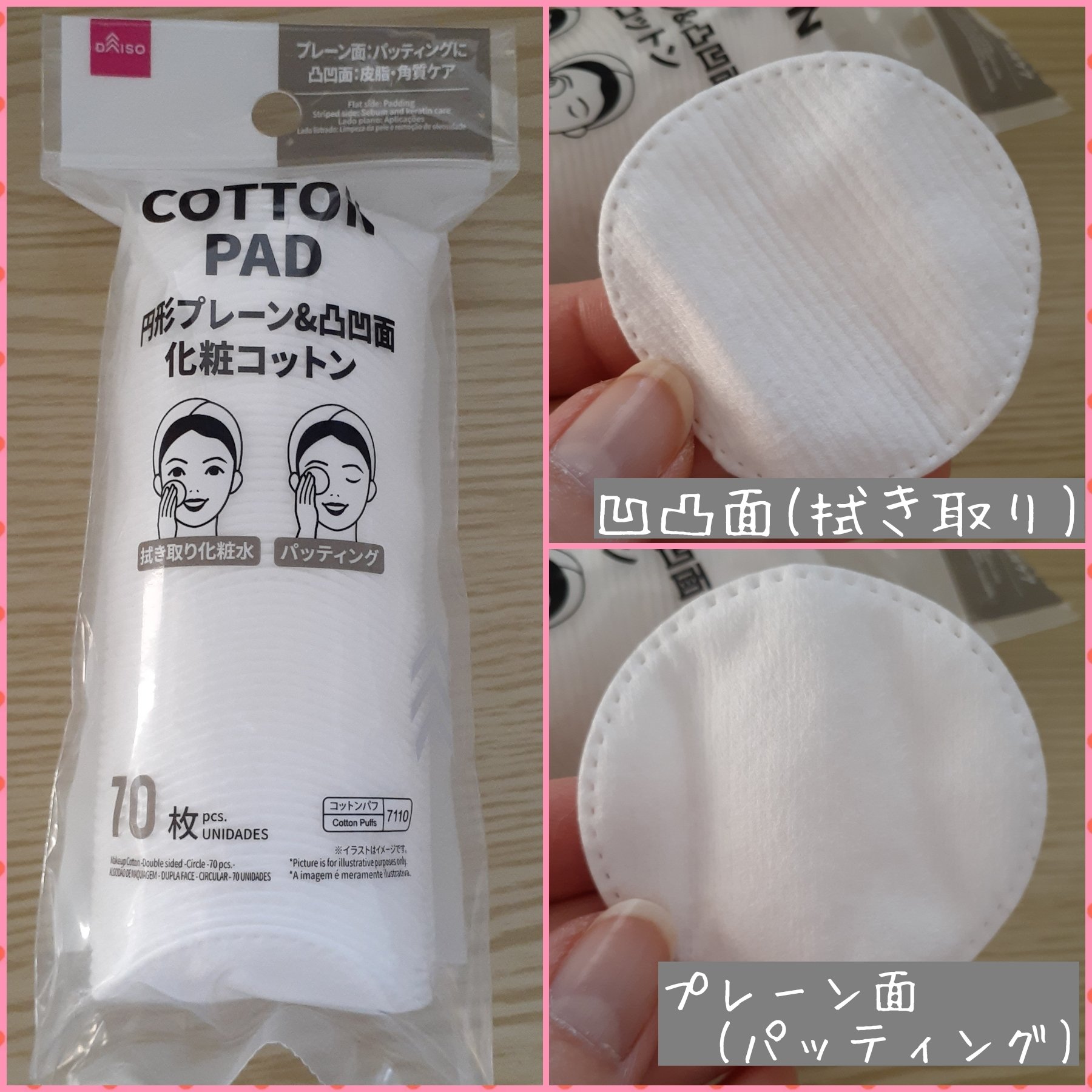 とにかく薄い! 片面がボコボコしていて、片面がなだらかです。化粧水を染み込ませて拭き取りに使ったら、結構痛かったです。 なだらかな面でも痛かった😭 パックに使うのがおすすめです。 ふかふかのコットンより化粧水少量で済みます。私は専らネイルに使っています。 このタイプのコットンが100均で買えるのは嬉しいですね。