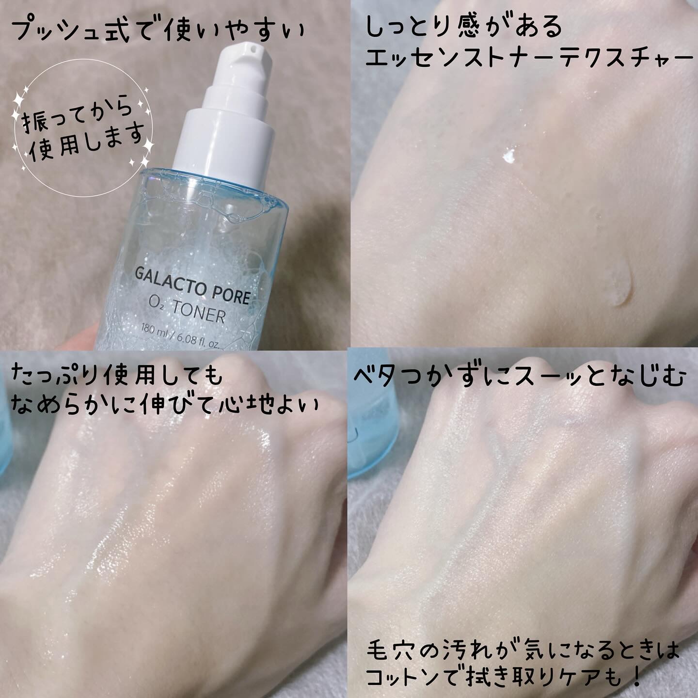 - ガラクトシリーズより新しく登場したガラクトポアオーツー(O2)トナー。 新感覚の酸素を含んだバブルエッセンスが毛穴に詰まった古い角質や過剰な皮脂をケアして肌のキメを整え、イキイキとした肌印象に導きます。 敏感なお肌にもやさしい使い心地で毛穴ケアが可能です。 しっとりべたつきのないテクスチャーで朝晩使用でき、さらに乾燥による毛穴目立ちを防ぐため肌表面に潤いを与えます。 皮膚低刺激テスト完了済*。敏感肌の方もご使用いただけます。 <特長成分> ガラクトミセス発酵ろ過物 : 肌にやさしい使い心地でうるおいを与える。(保湿成分) ウィッチヘーゼル : 肌を引き締めなめらかな印象をサポート。(整肌成分) PHA : 角質ケア成分配合。(角質柔軟成分) <テクスチャー&香り> - テクスチャー しっとり伸びやすく肌になじみやすいテクスチャー - 香り シトラスハーブ系 *全ての方に皮膚刺激が発生しないということではありません