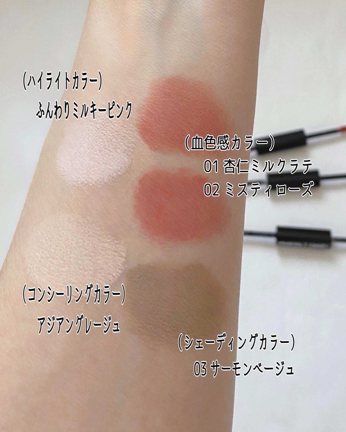 - マルチに使える!さっとひと塗りで、血色感と立体感をプラス。 ふんわりチークと自然なマットハイライト、シェーディングで、血色感と陰影をプラス。ひと塗りで、愛され美人なメイクに。 1本多役、3分間で立体感&血色感あふれる仕上がり ハイライトカラーと血色感カラーのダブルヘッドで、お肌の凹凸や悩みをカバーしながら、血色感や立体感をプラス!3分で叶える、ふんわり全顔メイク。 ハイライトカラー:気になる顔の凹凸部分や、頬のくぼみをカバー。ふっくらハリのある印象をつくります。 血色感カラー:チーク、リップ、アイシャドウとして使える万能カラー。フントーンメイクでじゅわっと血色感あふれるトレンド顔に。 72%保湿成分を配合、スーッとお肌にとろける極上のつけ心地 保湿成分*たっぷり配合したサラッと軽やかのクリームテクスチャー。肌に溶け込むように密着して、何度も重ねても厚塗り感ゼ口。高発色かつ簡単に毛穴などを力バーできて、初心者でもプ口級の仕上がりに。 *ヒアルロン酸Na、メドウフォーム種子油、スクワラン 8時間*、うるおいと血色感が続く うるおいを閉じ込めるダブルロック処方を採用、乾燥からお肌を守りながら、朝の仕上がりを長時間キープ。 *効能評価試験済み 陰影カラーで、自然な立体感を サーモンベージュのコンシーラー: クマやくすみを飛ばし、透明感あふれる明るい目元に。 ダスティグレージュのシェーディング: どんな肌色にも馴染みやすく、自然な陰影で彫りの深い美人顔に。