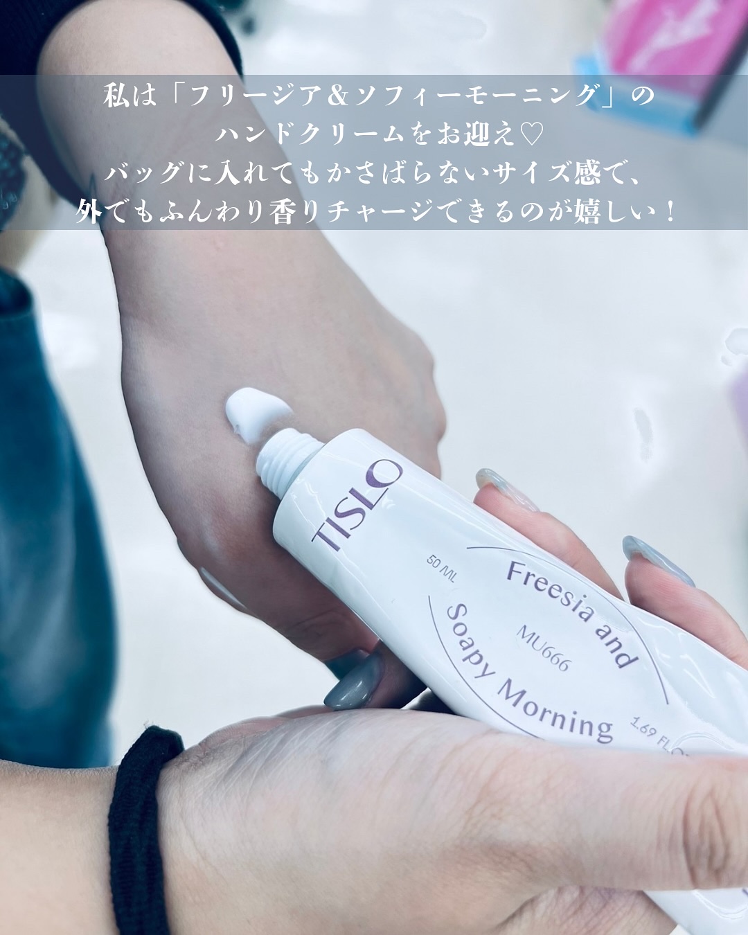 香水のように華やかに香るハンドクリームTISLO!香りが3つあるので、LOFTに嗅ぎに行ってきました。笑 フリージア&ソフィーモーニングにしました!なんというか、一番なじみやすい香りがした! ハンドクリームでも良い香りがほんのり続くので、ふとした時に癒されるー♡