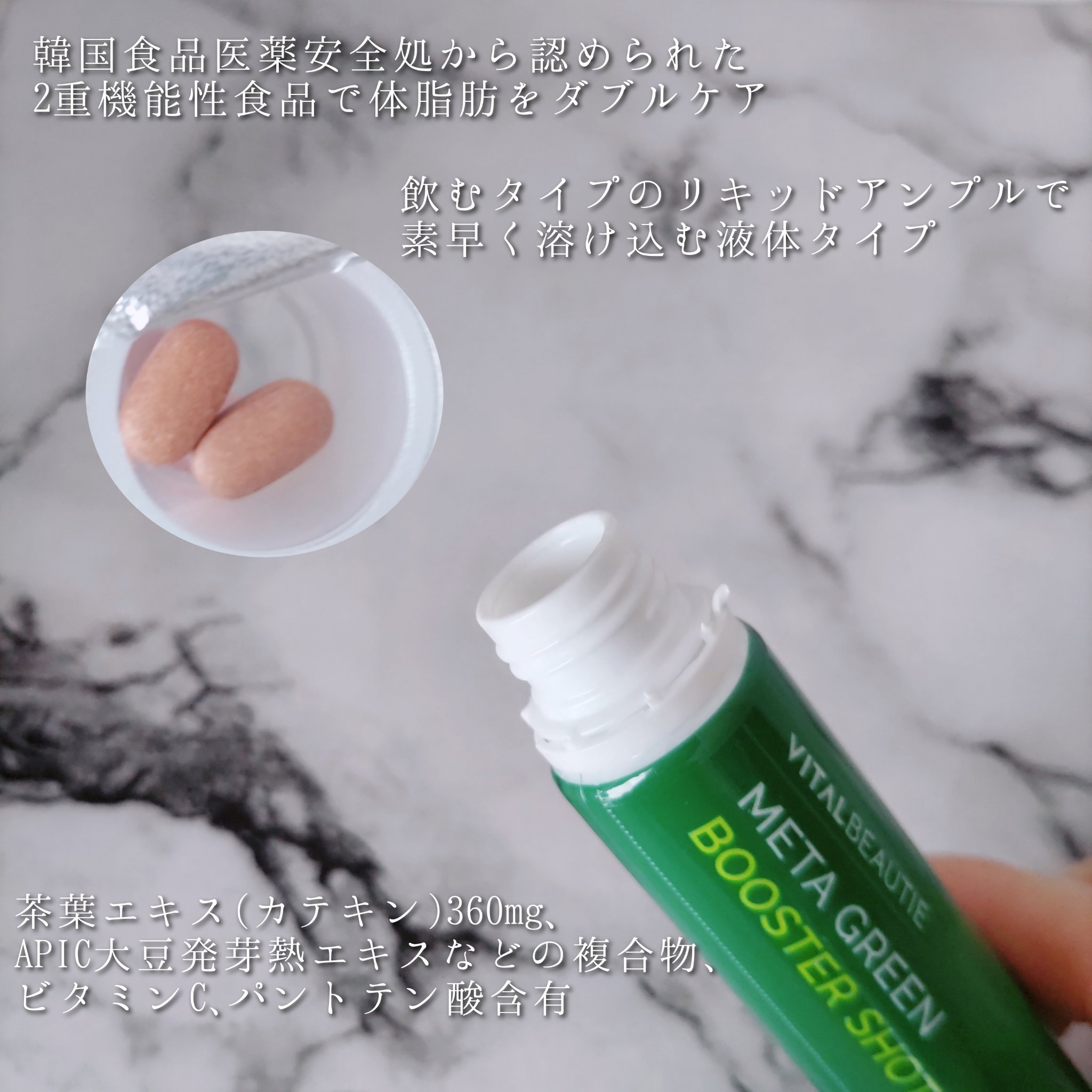 VITALBEAUTIEバイタルビューティーメタグリーンブースターショット1日1本、食後&運動前後に錠剤と液体を一緒に摂取するデュアルタイプ✨さっぱりとしたカラマンシー味の液体で素早く吸収浸透される飲むダイエット♪体脂肪ケアと脂肪燃焼サポート...