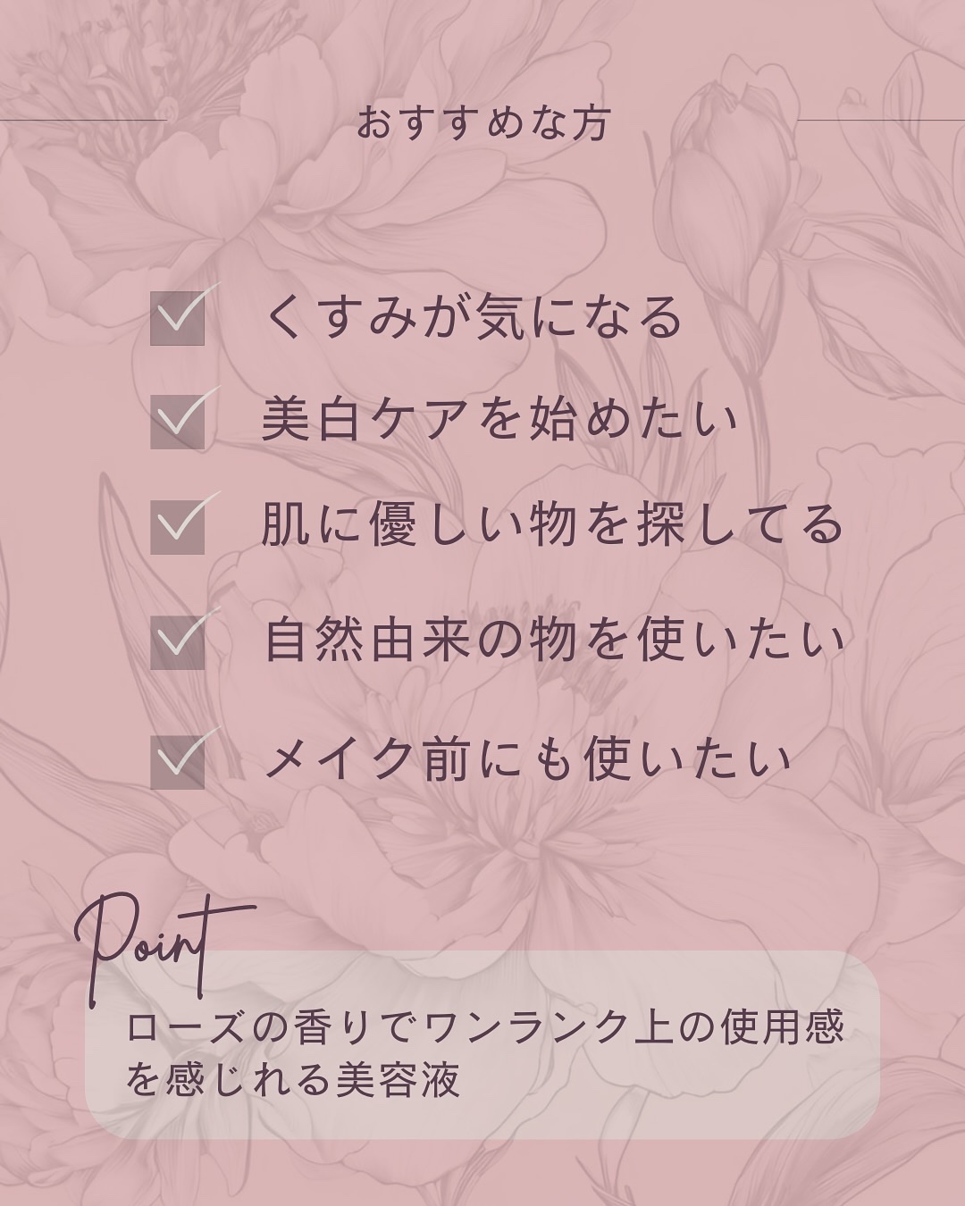 - 貴重なブルガリアンローズオイル*配合の美容液。ブルガリアンローズオイル*に、ダマスクバラ花水*、アルブチン*、多数の植物エキス*を配合することで、透き通るような透明感のある肌印象へ導きます。 韓国とイギリスのヴィーガン認証機関からヴィーガン認証を取得済み。動物原料配合や動物実験などはしていないヴィーガン美容液です。 3000本の中からたった1mLしか抽出できない、貴重なブルガリアンローズオイルに、ダマスクバラ花水、アルブチン等、多数の植物エキスを配合することで、みずみずしく透き通るような肌へ導きます。 *保湿成分