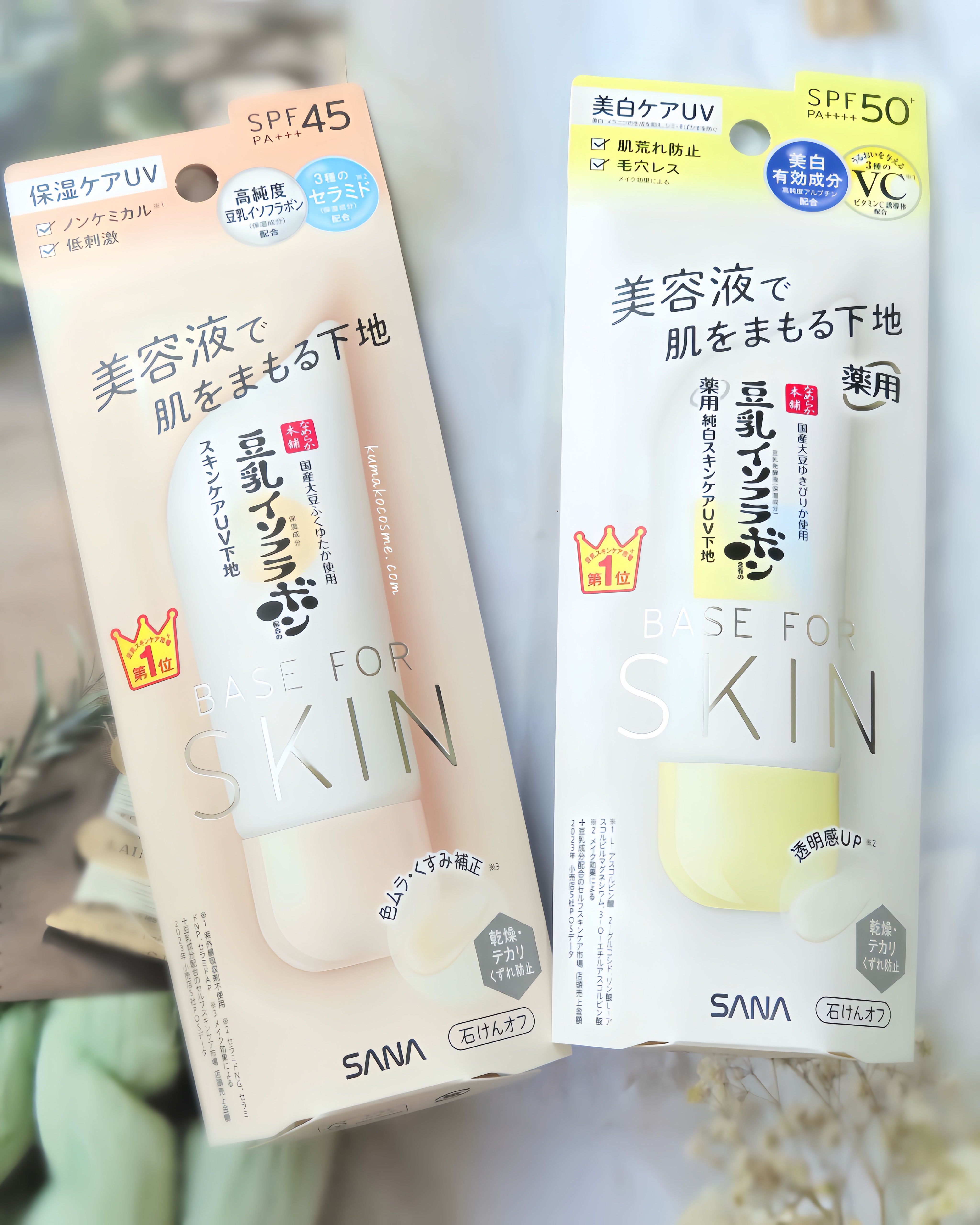 - 美容液で肌をまもる下地 豆乳スキンケア市場*1第1位 色ムラ・くすみ補正*2 乾燥・テカリくずれ防止 保湿ケア □ノンケミカル*3 □低刺激 石けんオフ 豆乳の保湿美容液下地 美容液生まれのUV下地で日中もお肌を守りながらうるおい満ちたお肌へ。 ○キメを整えてお肌を守るオリジナル成分 高純度豆乳イソフラボン ふくゆたか使用豆乳発酵液(すべて保湿成分) ○乾燥からバリア 3種の*4セラミド グリチルリチン酸2K*5 エクトイン*5 ビタミンE*6 長時間べたつかず、乾燥・皮脂くずれをW防止 8時間化粧持ちデータ取得済み*7 高密着パウダー*8 皮脂吸着パウダー*9 うるおい持続成分*10 美容液成分*11 87% オールインワン 洗顔後これ1つでOK! SPF45 PA+++ ブルーライトカット成分*12in *1 豆乳成分配合のセルフスキンケア市場 店頭売上金額2023年小売店5社POSデータ *2 メイク効果による *3 紫外線吸収剤不使用 *4 セラミドNG、セラミドNP、セラミドAP(すべて保湿) *5 保湿 *6 トコフェロール(製品の抗酸化成分) *7 当社調べ 仕上がりには個人差があります。(ツヤ・透明感・毛穴目立ちのなさ・薄れのなさ) *8 オキシ塩化ビスマス *9 シリカ *10 (エイコサン二酸/テトラデカン二酸)ポリグリセリル-10(保湿) *11 保湿成分(油性・水性)、水 *12 酸化チタン ●パッチテスト済み ●アレルギーテスト済み ●ノンコメドジェニックテスト済み (すべての方に皮フ刺激やアレルギーが起きない、また、ニキビのもとができないわけではありません。)