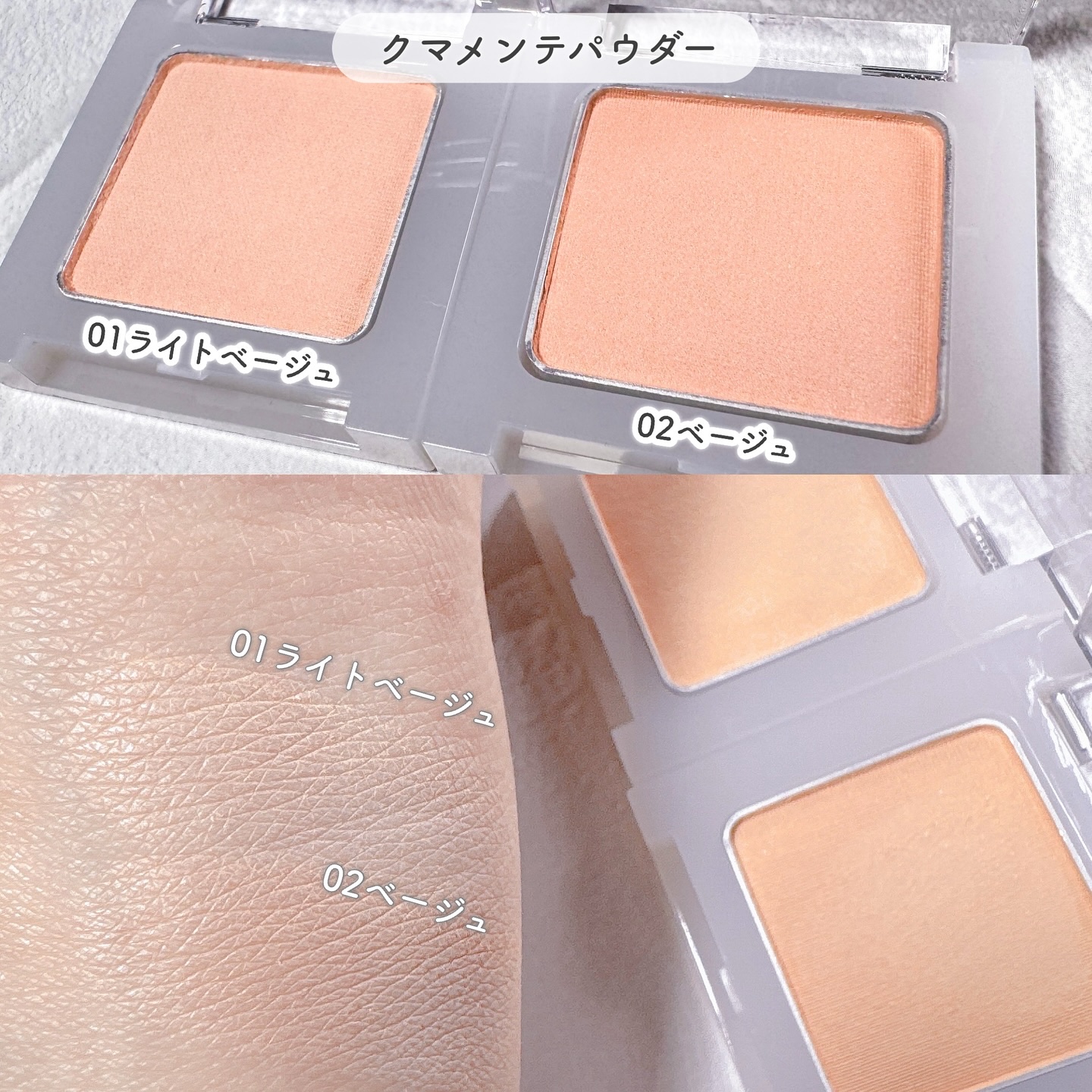 このパレットの1番の特徴は、「悪目立ちしない薄めの自然な色が1ミリの物足りなさもなくハッキリ色づく!」って感じの絶妙な色味と発色の良さだと思います。 あと、なめらかな粉質が抜群によくて肌に溶け込む。キメの整った立体感を作れるパレット。 02ウォームトーンだけ売り切れてるのをドンキやロフトでよく見かける通り、02ウォームトーンの色が抜群に綺麗! 02ウォームのマットハイライトは赤み抑えめなのにほのかな血色感が生まれていきいきした雰囲気になるし、下のきらきらジェルハイライトもつやんつやんのワンホンっぽい輝きですっごく可愛い。 右側のシェーディングは濃淡でグラデがつけやすく、ライティングの強さによってこのふたつで濃淡の調節がしやすいのも撮影現場ですごく助かってます。 捨て色のないパレットって貴重…!