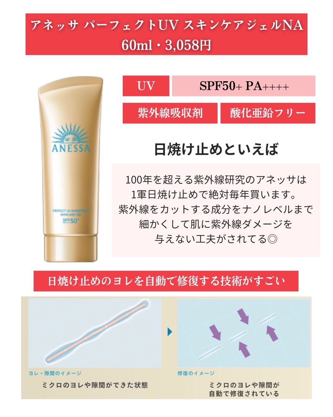 アネッサアネッサ パーフェクトUV スキンケアジェル NA¥2,508これは、めちゃくちゃお気に入りとなり、毎日メイクでも使用しています😍購入の決め手は、#酸化亜鉛フリーなところです☺️毛穴詰まりによる吹き出物ができやすいのと、金属アレルギー...
