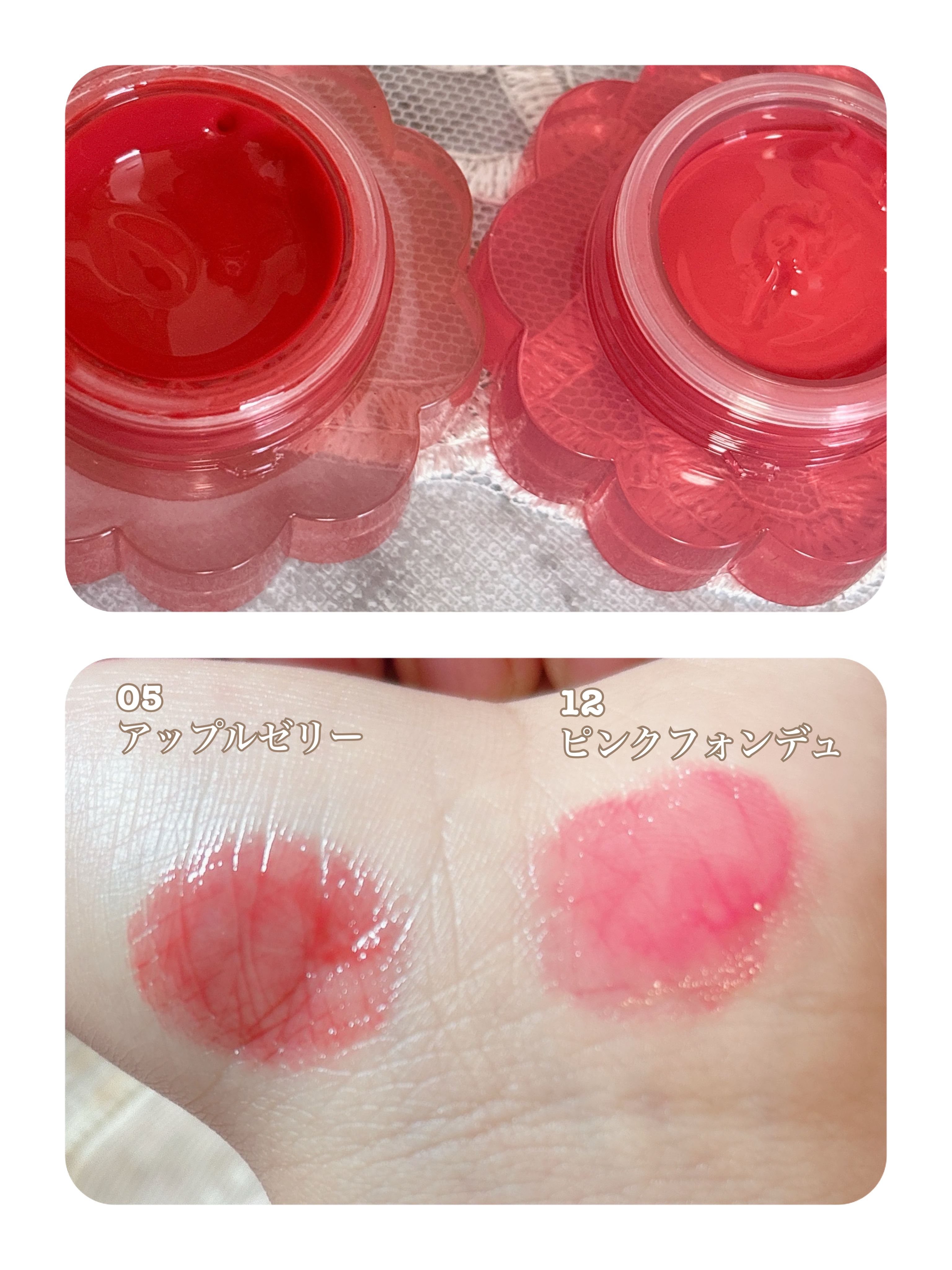 - <01 パパイヤクリーム> 水、ヘキサ(ヒドロキシステアリン酸/ステアリン酸/ロジン酸)ジペンタエリスリチル、トリエチルヘキサノイン、BG、グリセリン、オクチルドデカノール、ポリソルベート60、プロパンジオール、(PEG-240/デシルテトラデセス-20/HDI)コポリマー、1,2-ヘキサンジオール、セテアレス-20、フェノキシエタノール、エチルセルロース、カプリル酸グリセリル、(アクリル酸ヒドロキシエチル/アクリロイルジメチルタウリンNa)コポリマー、トリイソステアリン酸ポリグリセリル-2、リンゴ酸ジイソステアリル、酸化チタン、スクワラン、(アクリレーツ/アクリル酸アルキル(C10-30))クロスポリマー、トロメタミン、香料、エチルヘキシルグリセリン、黄4、赤104(1)、黄5、赤227、エチレンジアミンジコハク酸3Na、イソステアリン酸ソルビタン、ジイソステアリン酸ポリグリセリル-2、リナロール、ラウリン酸K、トコフェロール、青1 <02 ピーチドロップ> 水、ヘキサ(ヒドロキシステアリン酸/ステアリン酸/ロジン酸)ジペンタエリスリチル、トリエチルヘキサノイン、BG、グリセリン、オクチルドデカノール、ポリソルベート60、プロパンジオール、(PEG-240/デシルテトラデセス-20/HDI)コポリマー、1,2-ヘキサンジオール、セテアレス-20、フェノキシエタノール、リンゴ酸ジイソステアリル、酸化チタン、エチルセルロース、カプリル酸グリセリル、(アクリル酸ヒドロキシエチル/アクリロイルジメチルタウリンNa)コポリマー、トリイソステアリン酸ポリグリセリル-2、スクワラン、(アクリレーツ/アクリル酸アルキル(C10-30))クロスポリマー、トロメタミン、香料、エチルヘキシルグリセリン、黄5、赤104(1)、赤227、黄4、エチレンジアミンジコハク酸3Na、イソステアリン酸ソルビタン、ジイソステアリン酸ポリグリセリル-2、青1、リナロール、ラウリン酸K、トコフェロール <03 ハニーマンゴ> 水、ヘキサ(ヒドロキシステアリン酸/ステアリン酸/ロジン酸)ジペンタエリスリチル、トリエチルヘキサノイン、BG、グリセリン、オクチドデカノール、ポリソルベート60、プロパンジオール、(PEG-240/デシルテトラデセス-20/HDI)コポリマー、1,2-ヘキサンジオール、セテアレス-20、フェノキシエタノール、エチルセルロース、リンゴ酸ジイソステアリル、カプリル酸グリセリル、酸化チタン、(アクリル酸ヒドロキシエチル/アクリロイルジメチルタウリンNa)コポリマー、トリイソステアリン酸ポリグリセリル-2、スクワラン、(アクリレーツ/アクリル酸アルキル(C10-30))クロスポリマー、トロメタミン、香料、エチルヘキシルグリセリン、赤104(1)、黄5、赤227、黄4、エチレンジアミンジコハク酸3Na、イソステアリン酸ソルビタン、ジイソステアリン酸ポリグリセリル-2、リナロール、ラウリン酸K、トコフェロール、青1 <04 ピンクバブル> 水、ヘキサ(ヒドロキシステアリン酸/ステアリン酸/ロジン酸)ジペンタエリスリチル、トリエチルヘキサノイン、BG、グリセリン、オクチドデカノール、ポリソルベート60、プロパンジオール、(PEG-240/デシルテトラデセス-20/HDI)コポリマー、1,2-ヘキサンジオール、セテアレス-20、フェノキシエタノール、エチルセルロース、カプリル酸グリセリル、トリイソステアリン酸ポリグリセリル-2、(アクリル酸ヒドロキシエチル/アクリロイルジメチルタウリンNa)コポリマー、スクワラン、(アクリレーツ/アクリル酸アルキル(C10-30))クロスポリマー、リンゴ酸ジイソステアリル、酸化チタン、トロメタミン、香料、エチルヘキシルグリセリン、赤104(1)、酸化鉄、赤227、エチレンジアミンジコハク酸3Na、ジイソステアリン酸ポリグリセリル-2、黄4、イソステアリン酸ソルビタン、黄5、リナロール、ラウリン酸K、トコフェロール <05 アップルゼリー> 水、ヘキサ(ヒドロキシステアリン酸/ステアリン酸/ロジン酸)ジペンタエリスリチル、トリエチルヘキサノイン、BG、グリセリン、オクチドデカノール、ポリソルベート60、プロパンジオール、(PEG-240/デシルテトラデセス-20/HDI)コポリマー、1,2-ヘキサンジオール、セテアレス-20、フェノキシエタノール、トリイソステアリン酸ポリグリセリル-2、エチルセルロース、カプリル酸グリセリル、(アクリル酸ヒドロキシエチル/アクリロイルジメチルタウリンNa)コポリマー、スクワラン、(アクリレーツ/アクリル酸アルキル(C10-30))クロスポリマー、トロメタミン、香料、リンゴ酸ジイソステアリル、酸化チタン、エチルヘキシルグリセリン、赤227、黄5、赤104(1)、黄4、エチレンジアミンジコハク酸3Na、ジイソステアリン酸ポリグリセリル-2、イソステアリン酸ソルビタン、リナロール、ラウリン酸K、トコフェロール、青1 <06 クアバキャンディ> 水、ヘキサ(ヒドロキシステアリン酸/ステアリン酸/ロジン酸)ジペンタエリスリチル、トリエチルヘキサノイン、BG、グリセリン、オクチドデカノール、ポリソルベート60、プロパンジオール、(PEG-240/デシルテトラデセス-20/HDI)コポリマー、1,2-ヘキサンジオール、セテアレス-20、フェノ