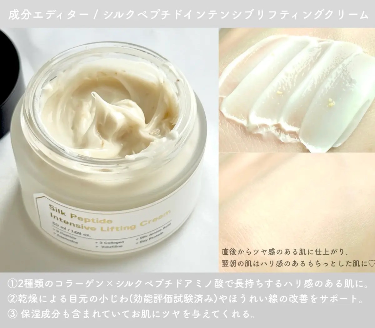 .#PR成分エディターシルクペプチドインテンシブリフティングクリーム塗る糸リフトと同ラインのリフティングクリーム🙏🏻♡もっちり糸引くテクスチャーがだいぶ好みだった。保湿感も翌朝まで保たれてるから不満なし。#SUNGBOONEDITOR#成分エ...