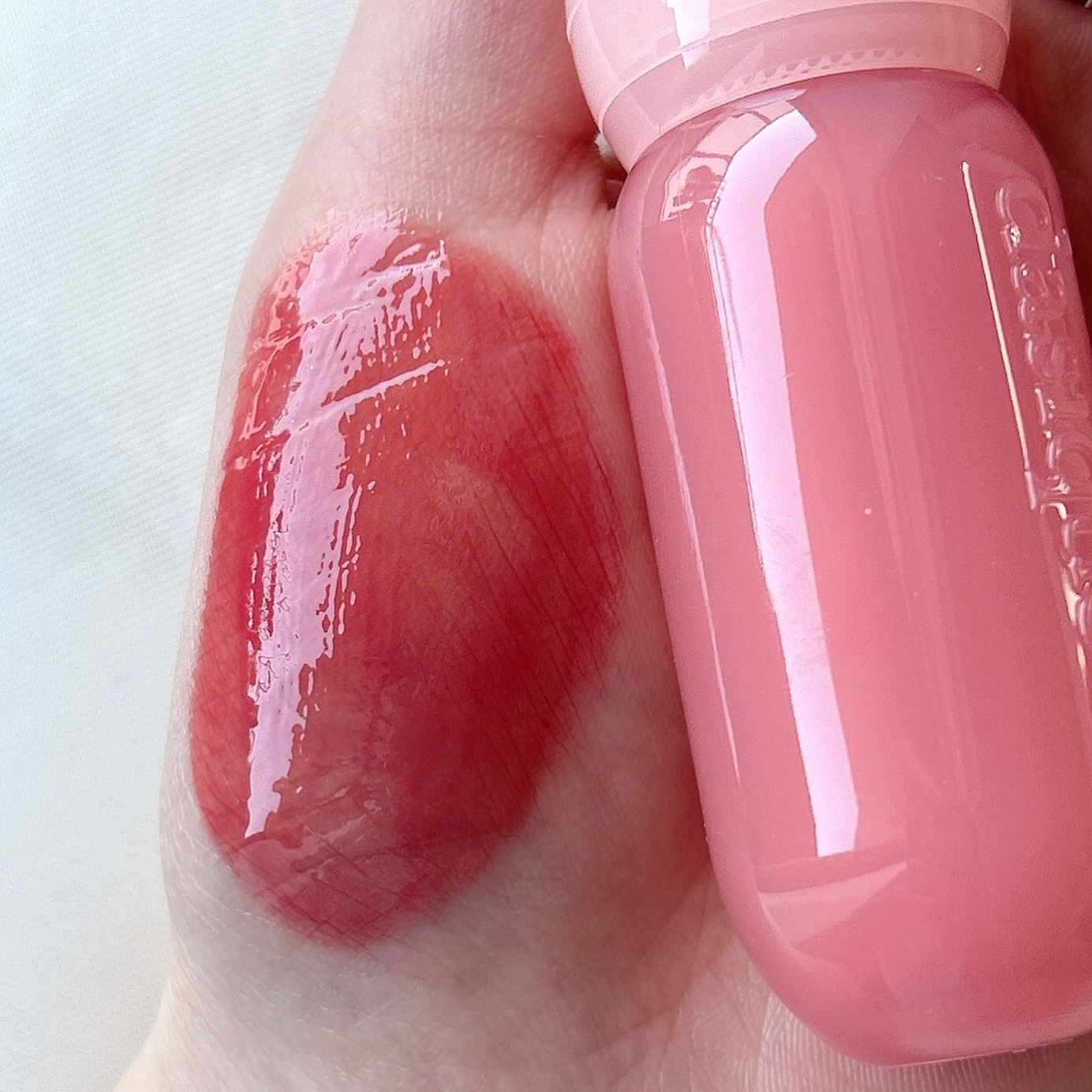 ガラス玉みたいなみずみずしいツヤのある人気のティントリップ。 私が購入した26 ローズブラックティーはクリアなローズピンクカラー🌹 ティッシュオフしてもしっかり色が定着していて色持ちも良く感じました。