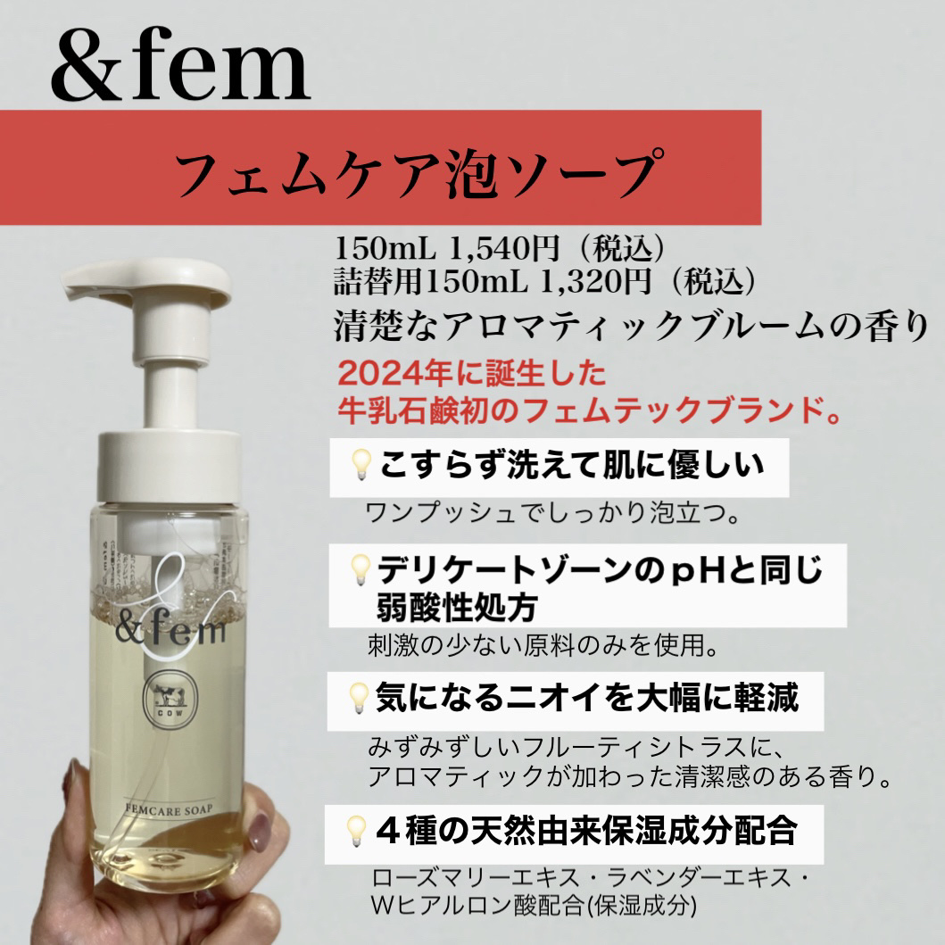 .&fem(アンドフェム)フェムケア泡ソープ150mL1,540円(税込)詰替用150mL1,320円(税込)あの赤箱で有名な牛乳石鹸からフェムケアがでてるの知ってる?✨泡で出てくるソープでデリケートゾーンのphと同じ弱酸性!擦らず優しく...