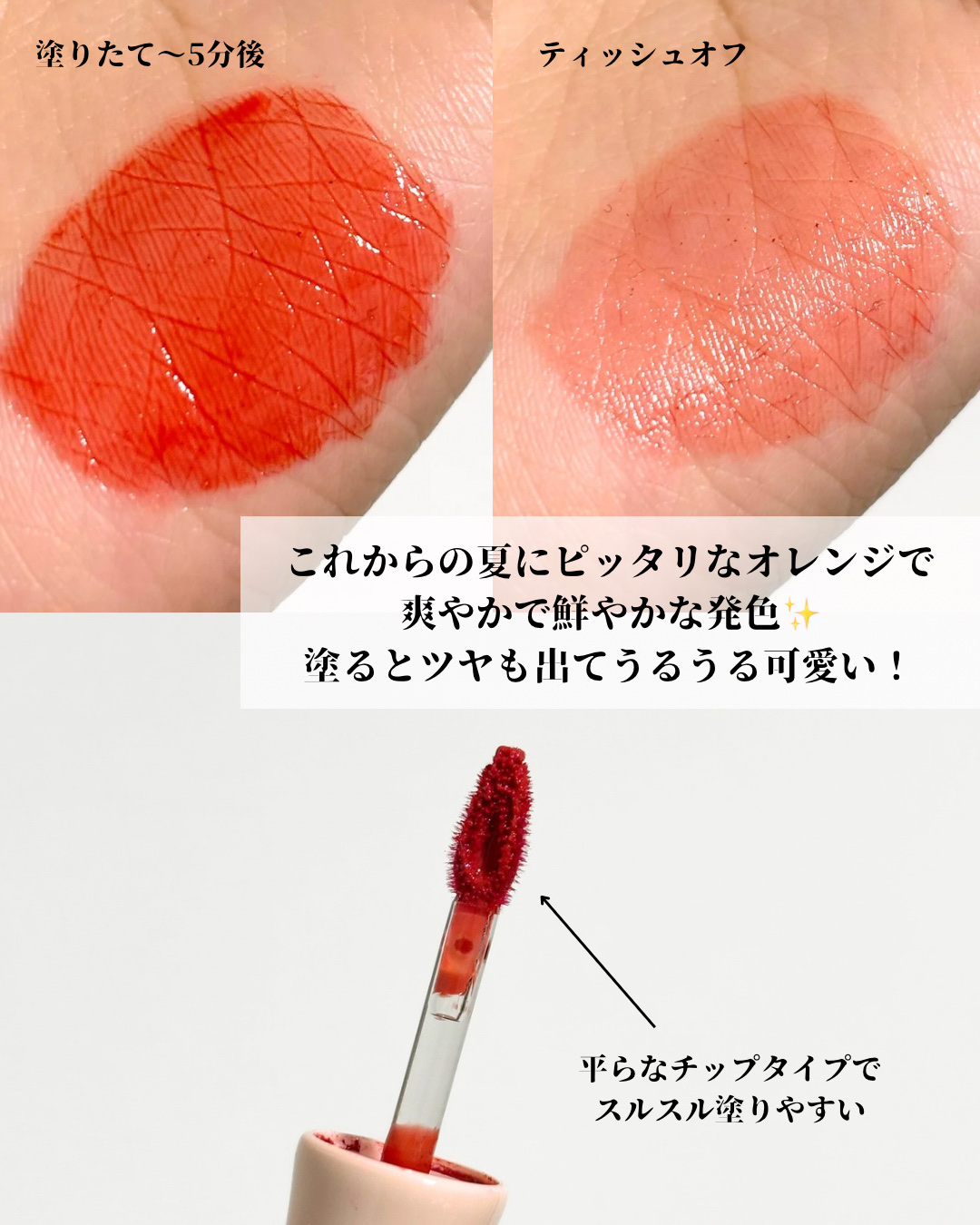 - 塗った瞬間はなめらか、時間とともにツヤが溢れる!もちぷる唇が完成するティントリップ ■透明感がありつつ、唇を包み込む艶オイル膜 時間とともにオイル膜が浮き上がり、唇をトップコートのようにコーティング。唇を包み込みながら、ボリュームのあるぷるぷるな唇へ。 ■塗り心地なめらかな水系ティント 水をベースにした水系処方。塗り心地なめらかなのにしっかりとした保湿感。 ■発色・色もちバツグン 軽い付け心地の高粘度オイルが密着感を高め、鮮やかなカラーが徐々に溶け込むように馴染みます。色もちも⻑時間キープします。 ■乾燥知らずのみずみずしい唇へ 保湿成分配合でずっとつづくみずみずしい唇になります。
