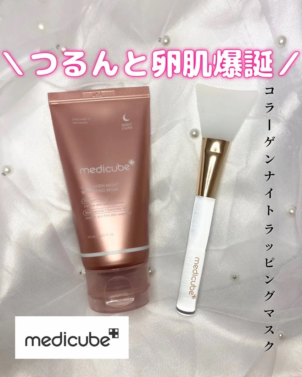 medicubeコラーゲンナイトラッピングマスクシリコンのブラシに出して塗るとムラになりにくく塗れて良かった🙆♀️乾くのも早かったし、寝相が悪くても寝具に付くこともなく安心✨起きてペリペリ剥がすと、ハリのあるむき卵肌に。キメも整ってもちもち...