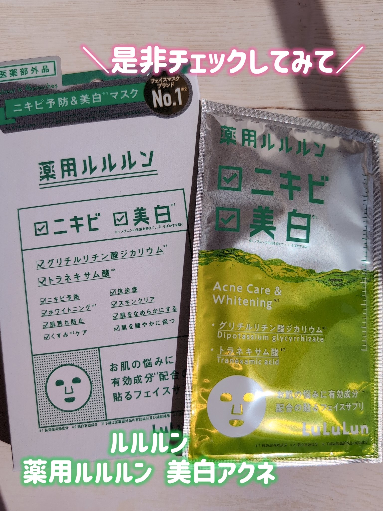 - 【医薬部外品】 ルルルン初の医薬部外品、「薬用ルルルン」が登場。 「薬用ルルルン 美白アクネ」はニキビを予防したい方、美白※1・くすみ※2をケアしたい方におすすめ。 (※1 メラニンの生成を抑えて、シミ・そばかすを防ぐ ※2乾燥による)