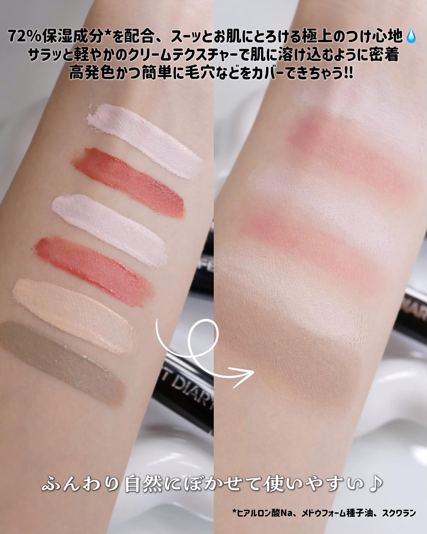 - マルチに使える!さっとひと塗りで、血色感と立体感をプラス。 ふんわりチークと自然なマットハイライト、シェーディングで、血色感と陰影をプラス。ひと塗りで、愛され美人なメイクに。 1本多役、3分間で立体感&血色感あふれる仕上がり ハイライトカラーと血色感カラーのダブルヘッドで、お肌の凹凸や悩みをカバーしながら、血色感や立体感をプラス!3分で叶える、ふんわり全顔メイク。 ハイライトカラー:気になる顔の凹凸部分や、頬のくぼみをカバー。ふっくらハリのある印象をつくります。 血色感カラー:チーク、リップ、アイシャドウとして使える万能カラー。フントーンメイクでじゅわっと血色感あふれるトレンド顔に。 72%保湿成分を配合、スーッとお肌にとろける極上のつけ心地 保湿成分*たっぷり配合したサラッと軽やかのクリームテクスチャー。肌に溶け込むように密着して、何度も重ねても厚塗り感ゼ口。高発色かつ簡単に毛穴などを力バーできて、初心者でもプ口級の仕上がりに。 *ヒアルロン酸Na、メドウフォーム種子油、スクワラン 8時間*、うるおいと血色感が続く うるおいを閉じ込めるダブルロック処方を採用、乾燥からお肌を守りながら、朝の仕上がりを長時間キープ。 *効能評価試験済み 陰影カラーで、自然な立体感を サーモンベージュのコンシーラー: クマやくすみを飛ばし、透明感あふれる明るい目元に。 ダスティグレージュのシェーディング: どんな肌色にも馴染みやすく、自然な陰影で彫りの深い美人顔に。