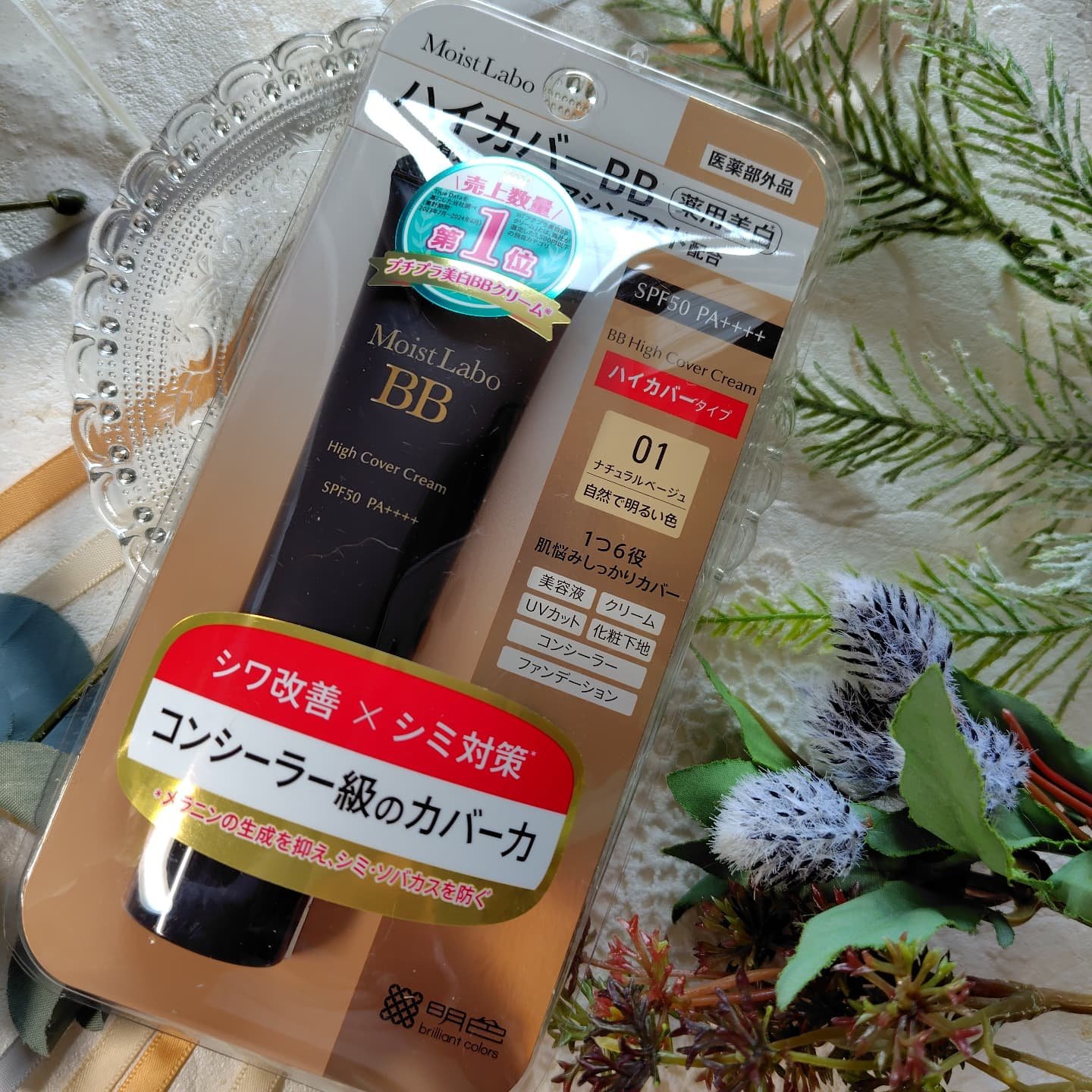 - 【医薬部外品】 「モイストラボ ハイカバー薬用美白BBクリーム」は薄付きなのにコンシーラー級のカバー力でしっかりとシミなどの肌悩みを隠しながら、同時にナイアシンアミド配合でつけている間中シワを改善し、美白対策もできる画期的なBBクリームです。 当社独自のモイスチャーマグネットHC配合でうるおい成分が密着し続け、リペアプロテクトCR配合でバリア効果も発揮。 1本6役(美容液・クリーム・UVカット・化粧下地・コンシーラー・ファンデーション)なので時短メイクなのに美しい仕上がりが叶います。 汗・水に強いウォータープルーフタイプでSPF50・PA++++なので春夏のメイクにも最適です。 〇薄膜で均一に仕上がり、厚塗り感なくシミ・くすみ・毛穴をしっかりカバー 〇密着カバーしながら、シワ改善と美白が同時に叶う 〇サラッとセミマット肌で崩れにくい 〇美白ケアしながらうるおう 〇コンシーラーいらずで1本でベースメイク完了 〇1本で6つの効果(美容液・クリーム・UVカット・化粧下地・コンシーラー・ファンデーション) 〇肌を守るバリア効果 〇汗・水に強いウォータープルーフタイプ 〇SPF50 PA++++