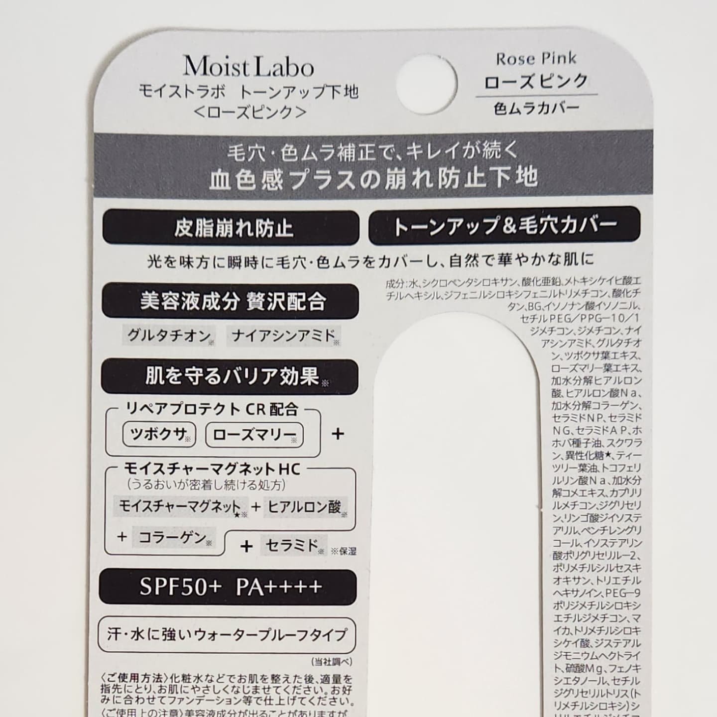 - 「モイストラボ トーンアップ下地」は光を味方にキレイを仕込む、崩れ防止下地です。毛穴・色ムラをカバーし、自然で華やかな肌に導く〈ローズピンク〉と、毛穴や黄ぐすみもカバーしてワントーン明るいお肌へ導く〈ラベンダー〉の2タイプです。 薄くて均一な塗膜に広がる独自の新技術採用で汗・水に強いウォータープルーフタイプで皮脂崩れも防止します。SPF50+・PA++++なので春夏のメイクにも最適です。 〇光を味方に瞬時に毛穴・色ムラをカバーし、自然で華やかな肌に〈ローズピンク〉 〇光を味方に瞬時に毛穴・黄ぐすみをカバーし、ワントーン明るい肌に〈ラベンダー〉 〇薄くて均一な塗膜に広がる独自の新技術採用 〇皮脂崩れ防止 〇トーンアップ&毛穴カバー 〇肌を守るバリア効果 〇注目美肌成分グルタチオンとナイアシンアミド配合 〇汗・水に強いウォータープルーフタイプ 〇SPF50+ PA++++