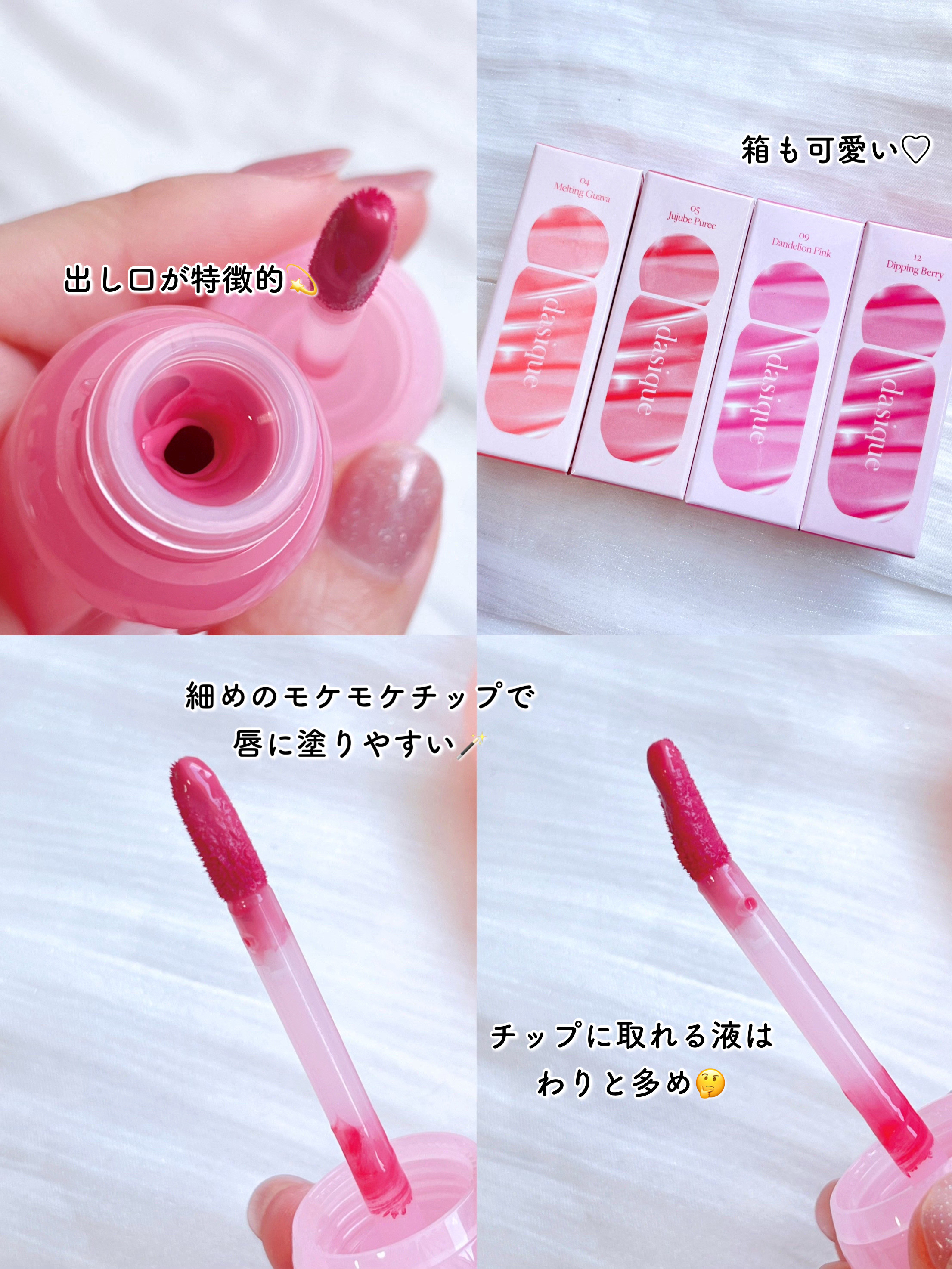 \イエベさん注目/春にぴったりなうるツヤリップ見つけたよ〜!🌸【dasiqueジューシーデュイティント】❤︎05ジュジュブピューレ:深みのあるムードレッドで大人っぽ❤︎07クレムドマロン:クリーム1滴混ぜたようなソフトブラウンで抜け感たっぷり...