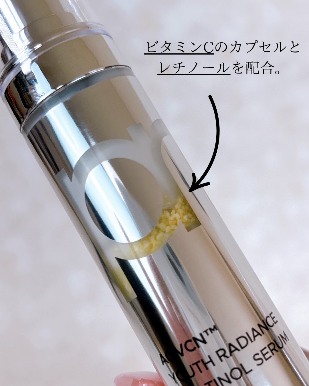 ビタミンC*1のカプセルとレチノール*2を配合。シナジー効果が1本に!! 透明感のある毛穴レスな印象肌へ。ビタミンC*160%含有カプセルと純度95%のレチノール*2を最適比率で配合。 乳液のような緩やかなテクスチャーでスっと伸びもよく、なじませているとしっとりモチモチします🥰✨