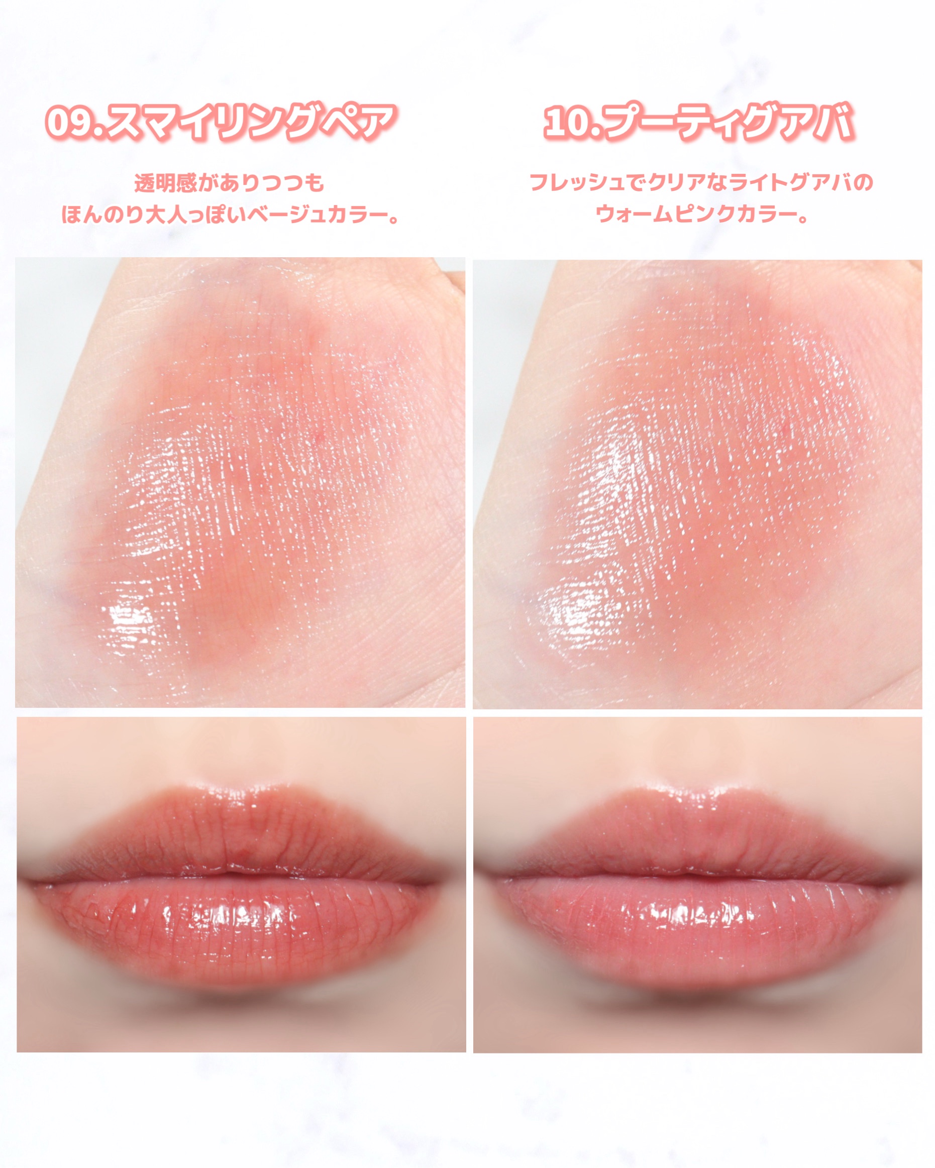 - <01 ベリーアメイジング> 水、デカイソステアリン酸ポリグリセリル-10、ビスジグリセリルポリアシルアジペート-2、ジフェニルジメチコン、フェニルトリメチコン、リンゴ酸ジイソステアリル、水添ポリイソブテン、ジグリセリン、ポリソルベート60、BG、セチルPEG/PPG-10/1ジメチコン、1,2-ヘキサンジオール、ペンチレングリコール、セテアレス-20、(アクリル酸ヒドロキシエチル/アクリロイルジメチルタウリンNa)コポリマー、スクワラン、フェノキシエタノール、エチルヘキシルグリセリン、香料、黄5、酸化チタン、イソステアリン酸ソルビタン、赤104(1)、赤227、水酸化Al、ポリアクリル酸アンモニウム、トコフェロール <02 アプリコットデュー> 水、デカイソステアリン酸ポリグリセリル-10、ビスジグリセリルポリアシルアジペート-2、ジフェニルジメチコン、フェニルトリメチコン、リンゴ酸ジイソステアリル、水添ポリイソブテン、ジグリセリン、ポリソルベート60、BG、セチルPEG/PPG-10/1ジメチコン、1,2-ヘキサンジオール、ペンチレングリコール、セテアレス-20、(アクリル酸ヒドロキシエチル/アクリロイルジメチルタウリンNa)コポリマー、スクワラン、フェノキシエタノール、酸化チタン、エチルヘキシルグリセリン、香料、黄4、黄5、イソステアリン酸ソルビタン、赤227、赤104(1)、水酸化Al、ポリアクリル酸アンモニウム、青1、トコフェロール <03 メリーピーチ> 水、デカイソステアリン酸ポリグリセリル-10、ビスジグリセリルポリアシルアジペート-2、ジフェニルジメチコン、フェニルトリメチコン、リンゴ酸ジイソステアリル、水添ポリイソブテン、ジグリセリン、ポリソルベート60、BG、セチルPEG/PPG-10/1ジメチコン、1,2-ヘキサンジオール、ペンチレングリコール、セテアレス-20、(アクリル酸ヒドロキシエチル/アクリロイルジメチルタウリンNa)コポリマー、スクワラン、フェノキシエタノール、酸化チタン、エチルヘキシルグリセリン、香料、黄4、赤227、イソステアリン酸ソルビタン、黄5、赤104(1)、水酸化Al、ポリアクリル酸アンモニウム、青1、トコフェロール <04 プラウドグレープ> 水、デカイソステアリン酸ポリグリセリル-10、ビスジグリセリルポリアシルアジペート-2、ジフェニルジメチコン、フェニルトリメチコン、リンゴ酸ジイソステアリル、水添ポリイソブテン、ジグリセリン、ポリソルベート60、BG、セチルPEG/PPG-10/1ジメチコン、1,2-ヘキサンジオール、ペンチレングリコール、セテアレス-20、(アクリル酸ヒドロキシエチル/アクリロイルジメチルタウリンNa)コポリマー、スクワラン、フェノキシエタノール、エチルヘキシルグリセリン、酸化チタン、香料、赤104(1)、黄4、イソステアリン酸ソルビタン、赤227、水酸化Al、ポリアクリル酸アンモニウム、青1、トコフェロール <05 レベルアップベリー> 水、デカイソステアリン酸ポリグリセリル-10、ビスジグリセリルポリアシルアジペート-2、ジフェニルジメチコン、フェニルトリメチコン、リンゴ酸ジイソステアリル、水添ポリイソブテン、ジグリセリン、ポリソルベート60、BG、セチルPEG/PPG-10/1ジメチコン、1,2-ヘキサンジオール、ペンチレングリコール、セテアレス-20、(アクリル酸ヒドロキシエチル/アクリロイルジメチルタウリンNa)コポリマー、スクワラン、フェノキシエタノール、エチルヘキシルグリセリン、香料、黄5、赤227、イソステアリン酸ソルビタン、青1、トコフェロール <06 ウーロンライチ> 水、デカイソステアリン酸ポリグリセリル-10、ビスジグリセリルポリアシルアジペート-2、ジフェニルジメチコン、フェニルトリメチコン、リンゴ酸ジイソステアリル、水添ポリイソブテン、ジグリセリン、ポリソルベート60、BG、セチルPEG/PPG-10/1ジメチコン、1,2-ヘキサンジオール、ペンチレングリコール、セテアレス-20、(アクリル酸ヒドロキシエチル/アクリロイルジメチルタウリンNa)コポリマー、スクワラン、フェノキシエタノール、酸化チタン、エチルヘキシルグリセリン、赤227、黄4、香料、イソステアリン酸ソルビタン、水酸化Al、ポリアクリル酸アンモニウム、青1、トコフェロール <07 プロップフィグ> 水、デカイソステアリン酸ポリグリセリル-10、ビスジグリセリルポリアシルアジペート-2、ジフェニルジメチコン、フェニルトリメチコン、リンゴ酸ジイソステアリル、水添ポリイソブテン、ジグリセリン、ポリソルベート60、BG、セチルPEG/PPG-10/1ジメチコン、1,2-ヘキサンジオール、ペンチレングリコール、セテアレス-20、(アクリル酸ヒドロキシエチル/アクリロイルジメチルタウリンNa)コポリマー、スクワラン、フェノキシエタノール、エチルヘキシルグリセリン、黄5、赤227、香料、イソステアリン酸ソルビタン、青1、トコフェロール <08 ジョイフルパーシモン> 水、デカイソステアリン酸ポリグリセリル-10、ビスジグリセリルポリアシルアジペート-2、ジフェニルジメチコン、フェニルトリメチコン、リンゴ酸ジイソステアリル、水添ポリイソブテン、ジグリセ