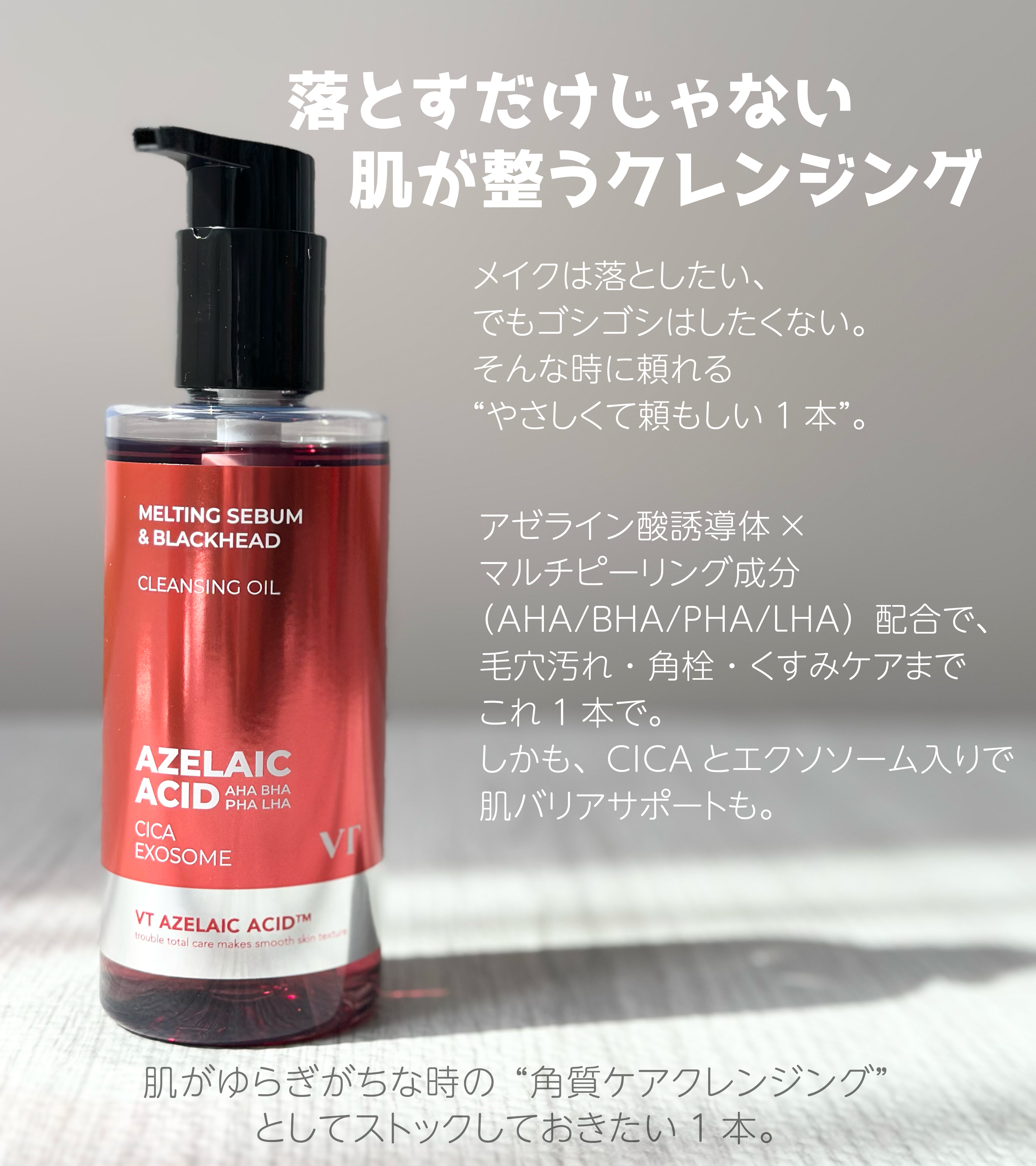 - 最近話題の毛穴ケア・整肌成分アゼライン酸!VTからはクレンジングオイルが登場! ポイントメイクまで落とすしっかりした洗浄力で、毛穴・皮脂までケアし保湿まで叶える一石三鳥アゼライン酸クレンジングオイル。 19種の植物性オイル*1も配合で、目に見えるブラッドヘッド*2から、隠れているホワイトヘッド*2、皮脂まですっきりケアします! ダブル洗顔不要! ※パッケージリニューアル ■このような方へおすすめ メイク・毛穴までディープクレンジング求める方 クレンジングでスキンケアまで行いたい方 ツッパリ感の少ないクレンジングを探していた方 ブラックヘッド*ケアも行いたい方 *1ダイズ油、アルガニアスピノサ核油、ユズ果実油、コメヌカ油、オタネニンジン種子油、アーモンド油、ザクロ種子油、リンゴ種子油、ホホバ種子油、ツバキ種子油、、バオバブ種子油、ユチャ種子油、ベニバナ種子油、ヒマワリ種子油、ヒポファエラムノイデス油、オリーブ果実油、アボカド油、アンズ核油、クロフサスグリ種子油(いずれも保湿) *2古い角質による