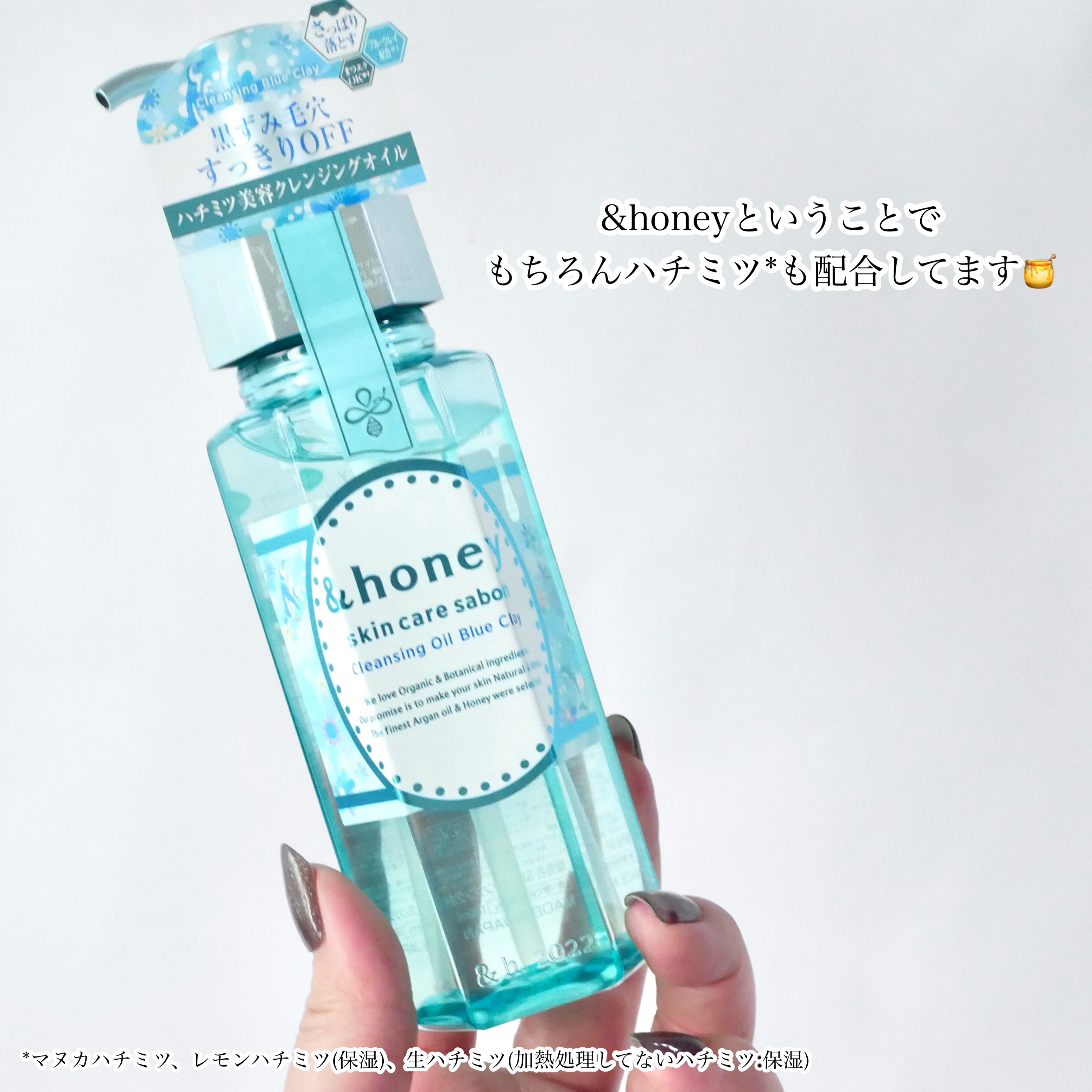 - &honeyの青泥クレンジングからオイルが登場。 毛穴の黒ずみ汚れ・お肌のざらつきをブルークレイ*1の力で吸着・除去し、つるすべ美肌へ導きます。 さらに製品の90%以上をCICA成分*2などの保湿&整肌成分で構成。 高い洗浄力でさっぱり落としつつ、つっぱりにくい仕上がりです。 香りは爽やかなエメラルドブルーハニーの香り。 *1 イライト(毛穴ケア) *2 ツボクサ葉エキス(整肌)
