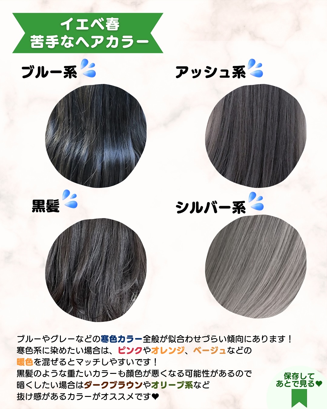パーソナルカラー別おすすめヘアカラーまとめヘアカラーは面積が大きい分、パーソナルカラーに合っているとぐっと顔色良く垢抜けて見えますよ💫スプリングタイプが得意なのは☑︎あたたかみのある色☑︎明るめな色☑︎ツヤ 例えばミルクティーベージュイエロー...