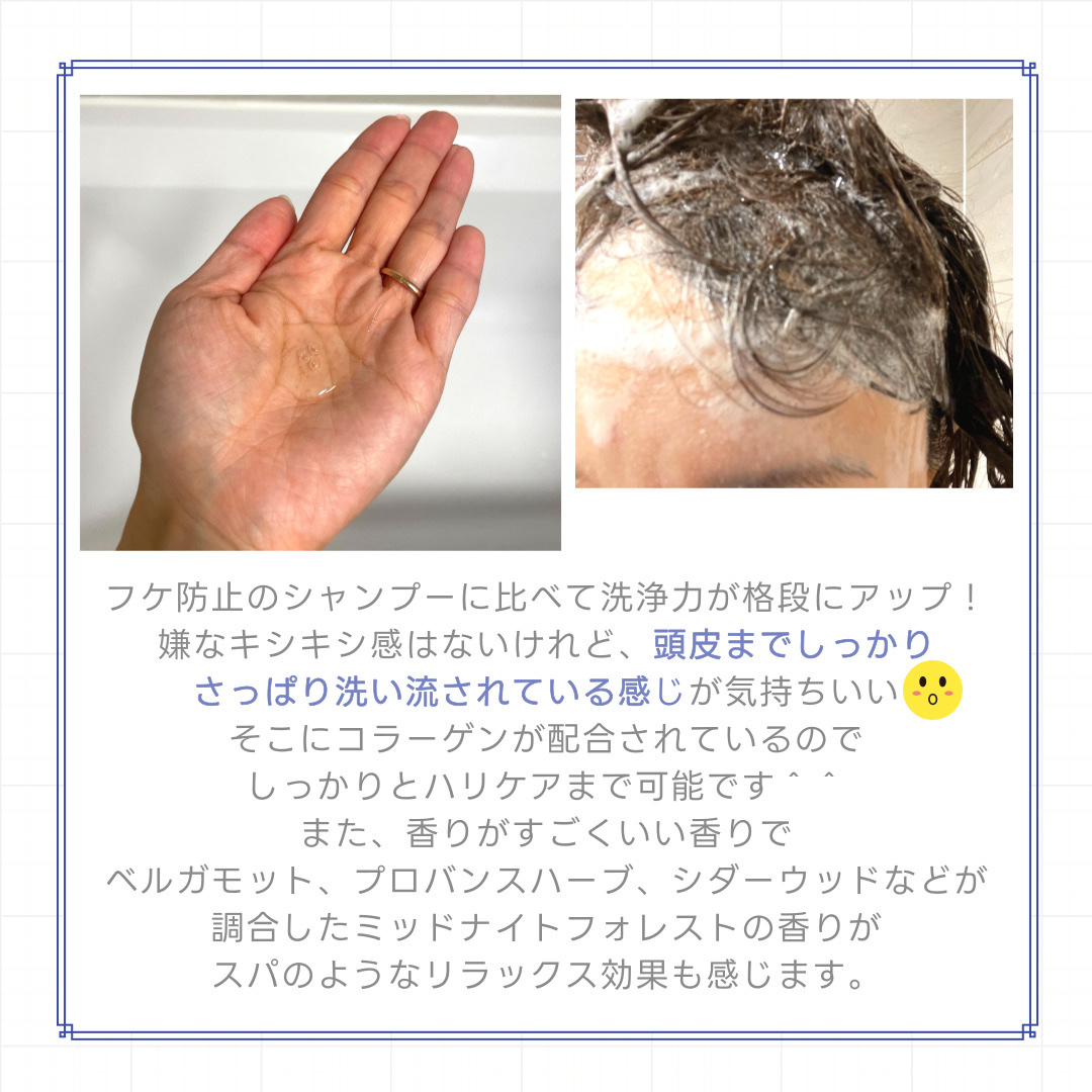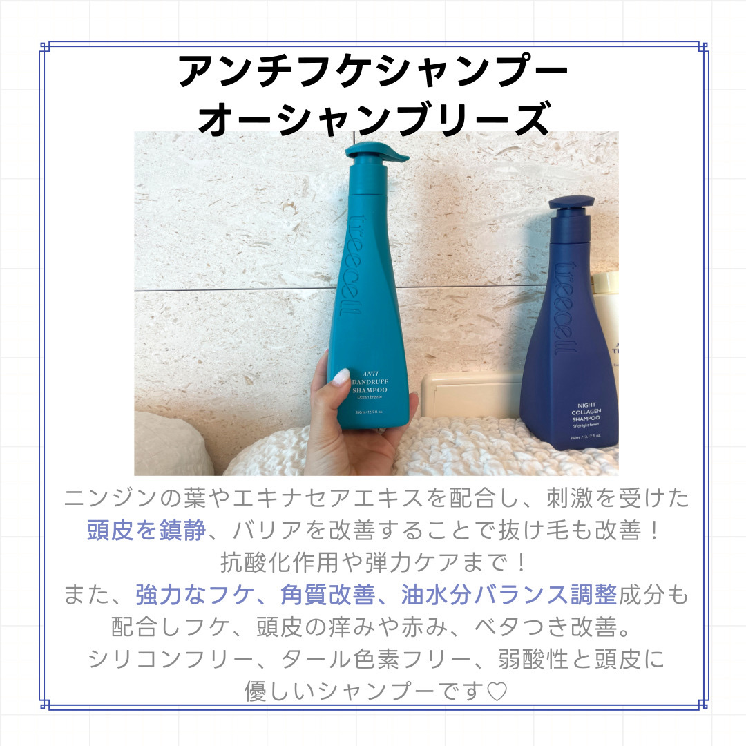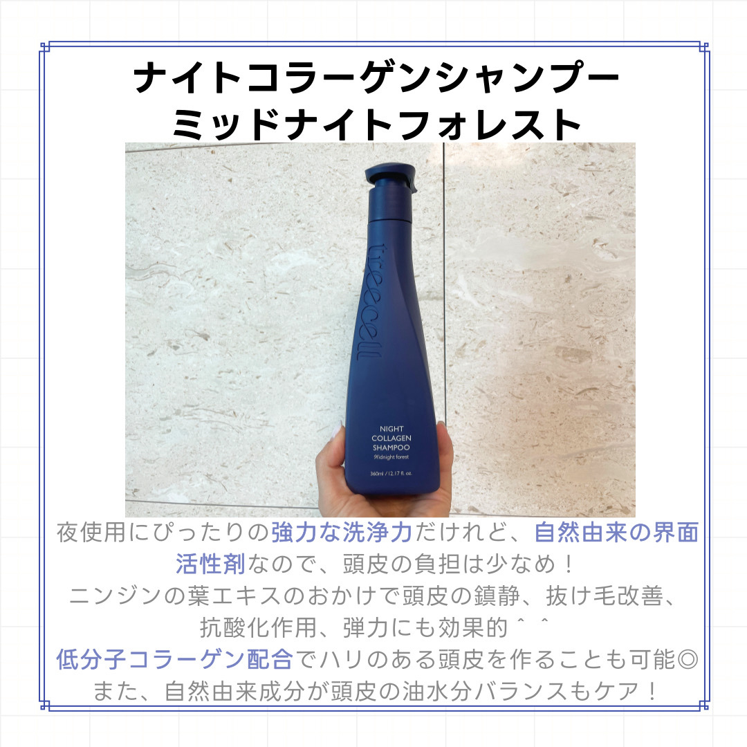 【使った商品】treecellナイトコラーゲンシャンプーミッドナイトフォレスト/フォルテアンプルトリートメント/トリプルボンディングトリートメント/アンチフケシャンプーオーシャンブリーズ🟦ミッドナイトフォレスト:爽やかな香りと強力な洗浄力「夜...
