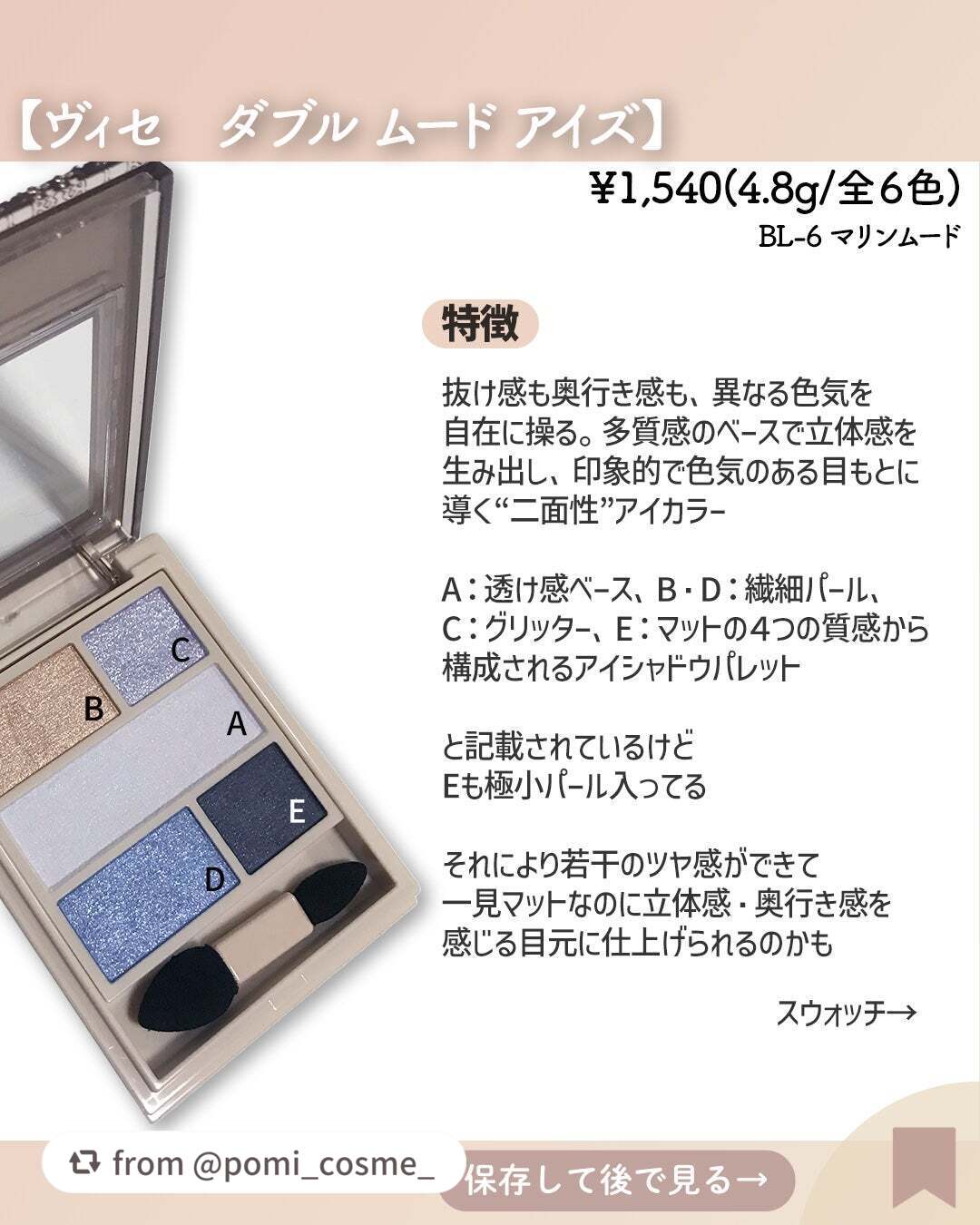| アイシャドウパレットランキング第167位 | 質感がふわふわ😳しっとりしててぴたっと密着‼️ ブレンドしやすく重ねるだけで、簡単に立体メイクの完成です💁♀️ | 詳細を見る | |