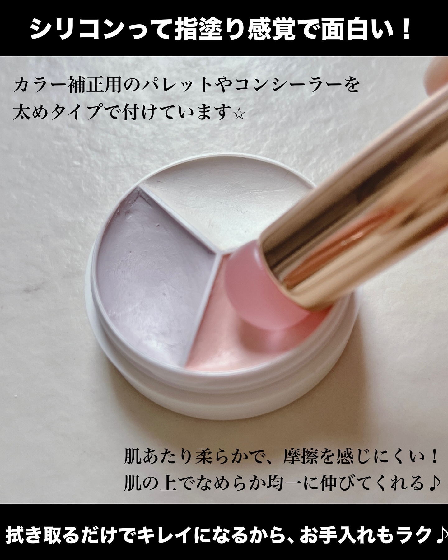 シリコンタイプのぷにぷに柔らかいブラシ♪ ツルッとした表面だから、摩擦感少なくて塗りやすい。 クリームとかリップが染み込まないから、サッと拭くだけでお手入れできるところも便利だよー◎ 今回買ったシリコンブラシ塗り:薄塗りでぼかしやすい、重ねて厚塗りもできた。シワ隠しやグラデ塗りにも使える!