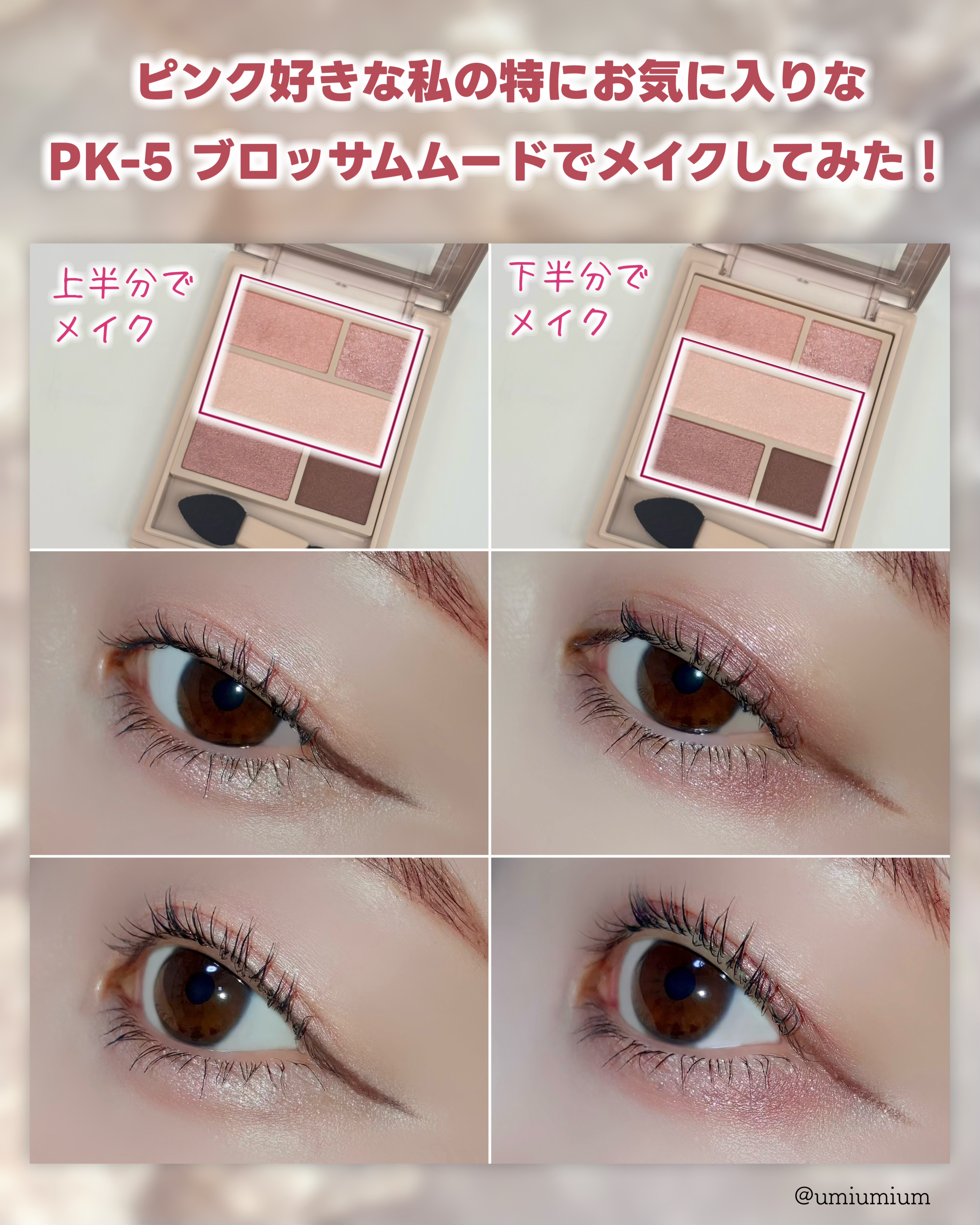 - 1つのパレットで2つの対照的な目もとを叶える、4質感の5色セットアイカラーです。 透け感ベース・繊細パール・グリッター・マットの多質感のベースを自在に組み合わせて、なりたい雰囲気や気分に合わせて印象チェンジを楽しめます。