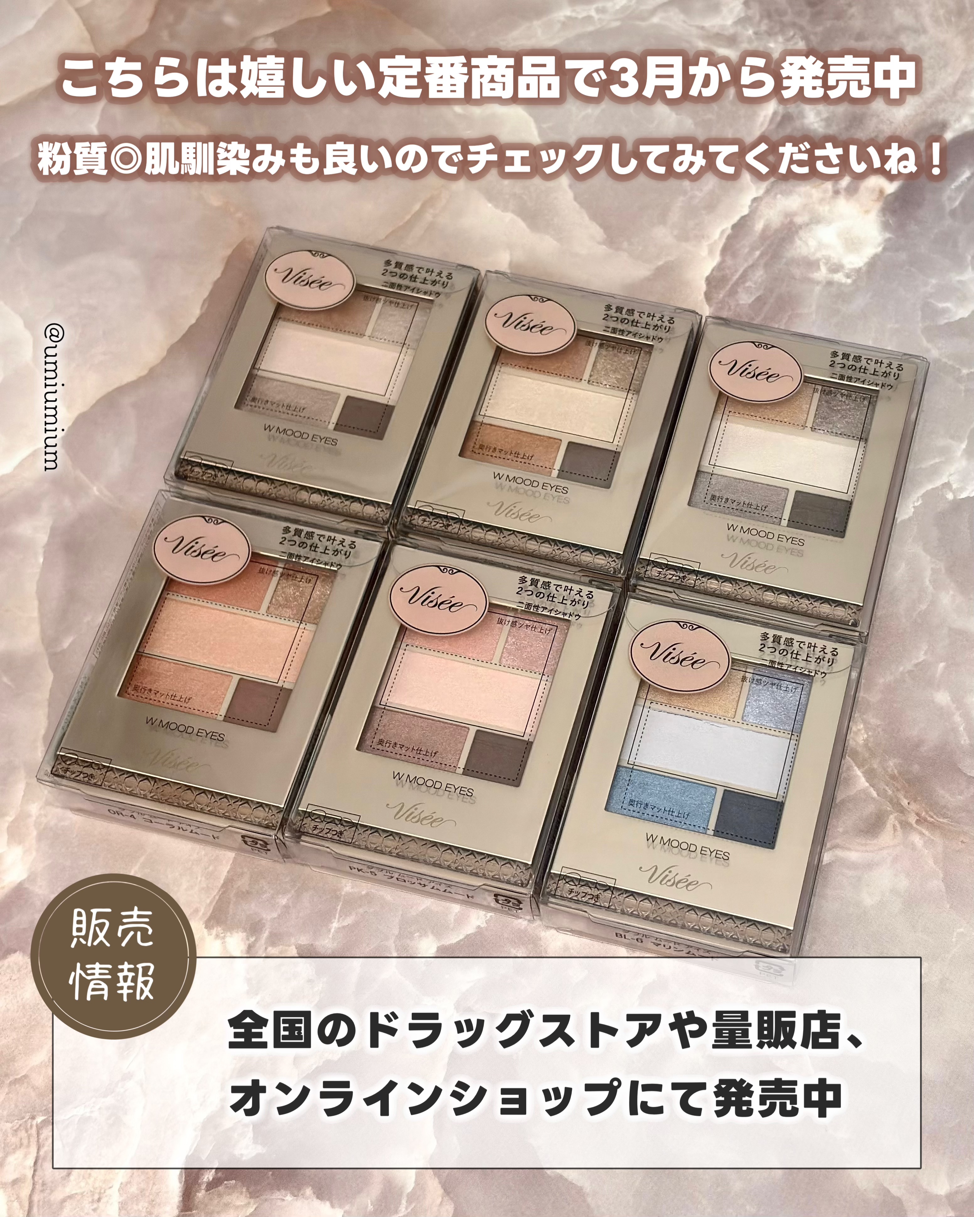 1つでツヤとマット両方のメイクができる 4質感、5色のパレット。中央の透け感ベースに上の2色を合わせれば抜け感のあるツヤ仕上げ。 相変わらず粉質が上質でプチプラとは思えない仕上がり🤎 ヘビロテ確定です🦄💓 Visée ダブル ムード アイズ 全6色 ¥1,540(税込) 2025年3月16日発売