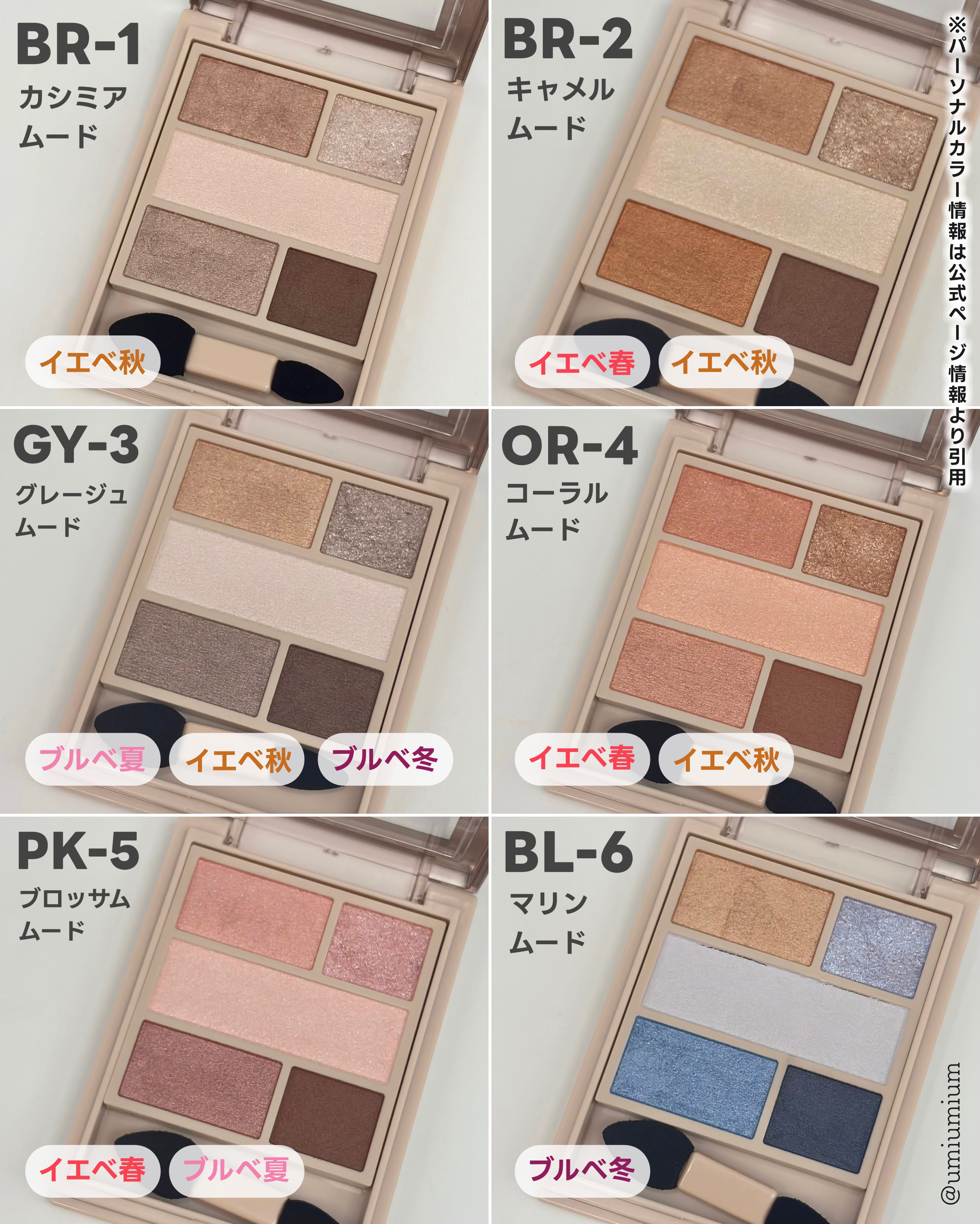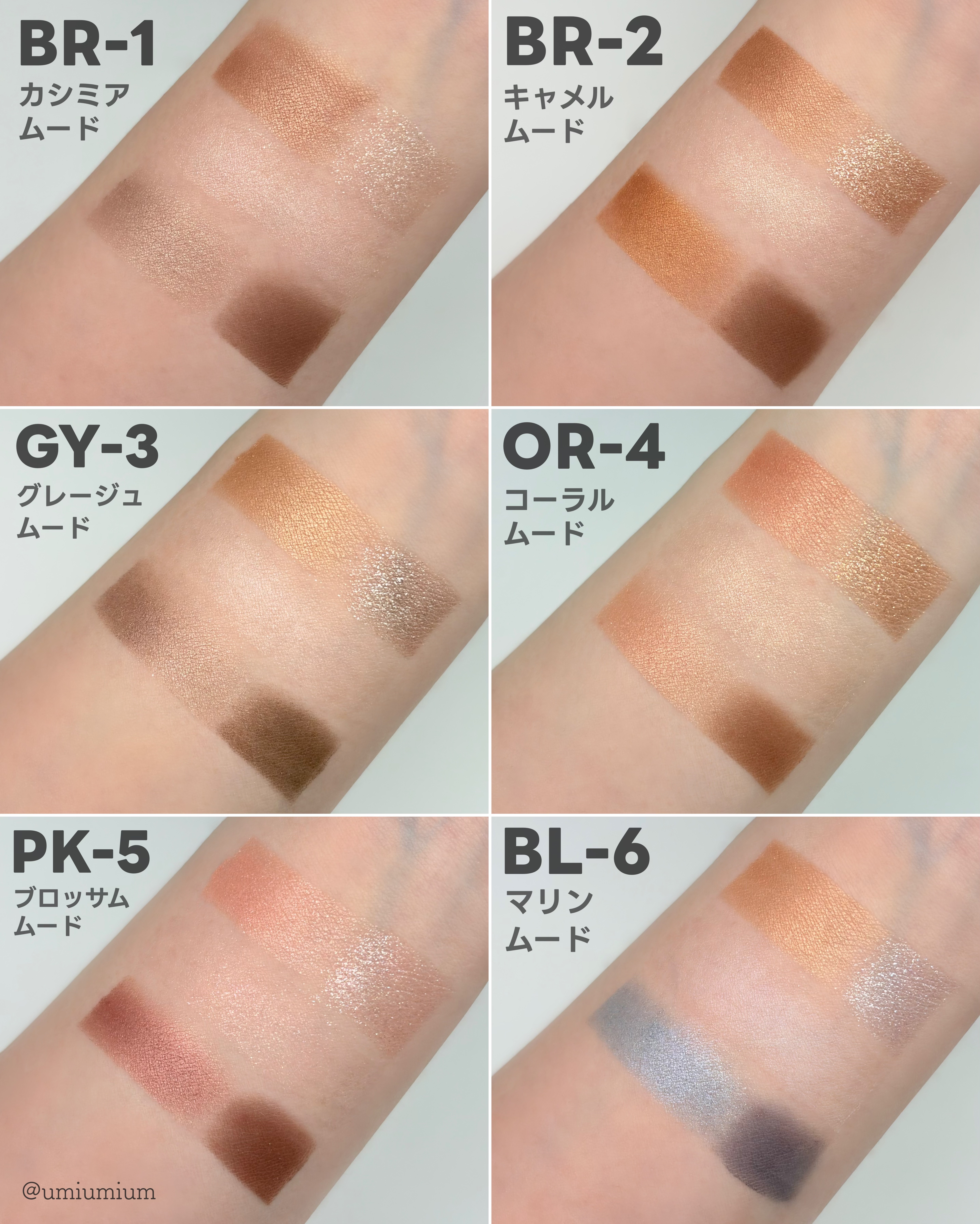 - <BR-1 カシミアムード> タルク、ジメチコン、合成フルオロフロゴパイト、水添ポリイソブテン、ミネラルオイル、メタクリル酸メチルクロスポリマー、リンゴ酸ジイソステアリル、トリエチルヘキサノイン、ホウケイ酸(Ca/Al)、セスキステアリン酸ソルビタン、エチルヘキサン酸セチル、トコフェロール、ヒアルロン酸Na、(ジメチコン/ビニルジメチコン)クロスポリマー、(ビニルジメチコン/ラウリルジメチコン)クロスポリマー、イソドデカン、シリカ、スクワラン、テトライソステアリン酸ポリグリセリル-2、トリエトキシカプリリルシラン、ナイロン-12、パラフィン、ヘキサ(ヒドロキシステアリン酸/ステアリン酸/ロジン酸)ジペンタエリスリチル、マイクロクリスタリンワックス、酸化スズ、水酸化Al、グンジョウ、マイカ、酸化チタン、酸化亜鉛、酸化鉄 <BR-2 キャメルムード> タルク、ジメチコン、合成フルオロフロゴパイト、水添ポリイソブテン、ミネラルオイル、メタクリル酸メチルクロスポリマー、リンゴ酸ジイソステアリル、ホウケイ酸(Ca/Al)、トリエチルヘキサノイン、セスキステアリン酸ソルビタン、エチルヘキサン酸セチル、トコフェロール、ヒアルロン酸Na、(ジメチコン/ビニルジメチコン)クロスポリマー、(ビニルジメチコン/ラウリルジメチコン)クロスポリマー、イソドデカン、シリカ、スクワラン、トリエトキシカプリリルシラン、ナイロン-12、パラフィン、ヘキサ(ヒドロキシステアリン酸/ステアリン酸/ロジン酸)ジペンタエリスリチル、マイクロクリスタリンワックス、マルトデキストリン、酸化スズ、水酸化Al、カルミン、グンジョウ、マイカ、酸化チタン、酸化亜鉛、酸化鉄 <GY-3 グレージュムード> タルク、ジメチコン、水添ポリイソブテン、ミネラルオイル、合成フルオロフロゴパイト、メタクリル酸メチルクロスポリマー、リンゴ酸ジイソステアリル、トリエチルヘキサノイン、ホウケイ酸(Ca/Al)、セスキステアリン酸ソルビタン、エチルヘキサン酸セチル、トコフェロール、ヒアルロン酸Na、(ジメチコン/ビニルジメチコン)クロスポリマー、(ビニルジメチコン/ラウリルジメチコン)クロスポリマー、イソドデカン、シリカ、スクワラン、トリエトキシカプリリルシラン、ナイロン-12、パラフィン、ヘキサ(ヒドロキシステアリン酸/ステアリン酸/ロジン酸)ジペンタエリスリチル、マイクロクリスタリンワックス、酸化スズ、グンジョウ、マイカ、酸化チタン、酸化亜鉛、酸化鉄 <OR-4 コーラルムード> タルク、ジメチコン、合成フルオロフロゴパイト、水添ポリイソブテン、ミネラルオイル、リンゴ酸ジイソステアリル、メタクリル酸メチルクロスポリマー、トリエチルヘキサノイン、ホウケイ酸(Ca/Al)、セスキステアリン酸ソルビタン、トコフェロール、ヒアルロン酸Na、(ジメチコン/ビニルジメチコン)クロスポリマー、(ビニルジメチコン/ラウリルジメチコン)クロスポリマー、イソドデカン、エチルヘキサン酸セチル、シリカ、スクワラン、テトライソステアリン酸ポリグリセリル-2、トリエトキシカプリリルシラン、ナイロン-12、ヘキサ(ヒドロキシステアリン酸/ステアリン酸/ロジン酸)ジペンタエリスリチル、ホウケイ酸(Ca/チタン)、酸化スズ、水酸化Al、グンジョウ、マイカ、酸化チタン、酸化亜鉛、酸化鉄 <PK-5 ブロッサムムード> タルク、ジメチコン、合成フルオロフロゴパイト、水添ポリイソブテン、ミネラルオイル、ホウケイ酸(Ca/Al)、メタクリル酸メチルクロスポリマー、リンゴ酸ジイソステアリル、トリエチルヘキサノイン、セスキステアリン酸ソルビタン、エチルヘキサン酸セチル、シリカ、トコフェロール、ヒアルロン酸Na、(ジメチコン/ビニルジメチコン)クロスポリマー、(ビニルジメチコン/ラウリルジメチコン)クロスポリマー、イソドデカン、スクワラン、テトライソステアリン酸ポリグリセリル-2、トリエトキシカプリリルシラン、ナイロン-12、パラフィン、ヘキサ(ヒドロキシステアリン酸/ステアリン酸/ロジン酸)ジペンタエリスリチル、マイクロクリスタリンワックス、酸化スズ、Al、グンジョウ、マイカ、酸化チタン、酸化亜鉛、酸化鉄、黄4、赤226 <BL-6 マリンムード> タルク、ジメチコン、水添ポリイソブテン、ミネラルオイル、リンゴ酸ジイソステアリル、合成フルオロフロゴパイト、メタクリル酸メチルクロスポリマー、トリエチルヘキサノイン、セスキステアリン酸ソルビタン、トコフェロール、ヒアルロン酸Na、(ジメチコン/ビニルジメチコン)クロスポリマー、(チタン/酸化チタン)焼結物、(ビニルジメチコン/ラウリルジメチコン)クロスポリマー、イソドデカン、エチルヘキサン酸セチル、シリカ、スクワラン、トリエトキシカプリリルシラン、ナイロン-12、ヘキサ(ヒドロキシステアリン酸/ステアリン酸/ロジン酸)ジペンタエリスリチル、ホウケイ酸(Ca/Al)、酸化スズ、水酸化Al、クロルフェネシン、グンジョウ、コンジョウ、マイカ、酸化チタン、酸化亜鉛、酸化鉄、赤226