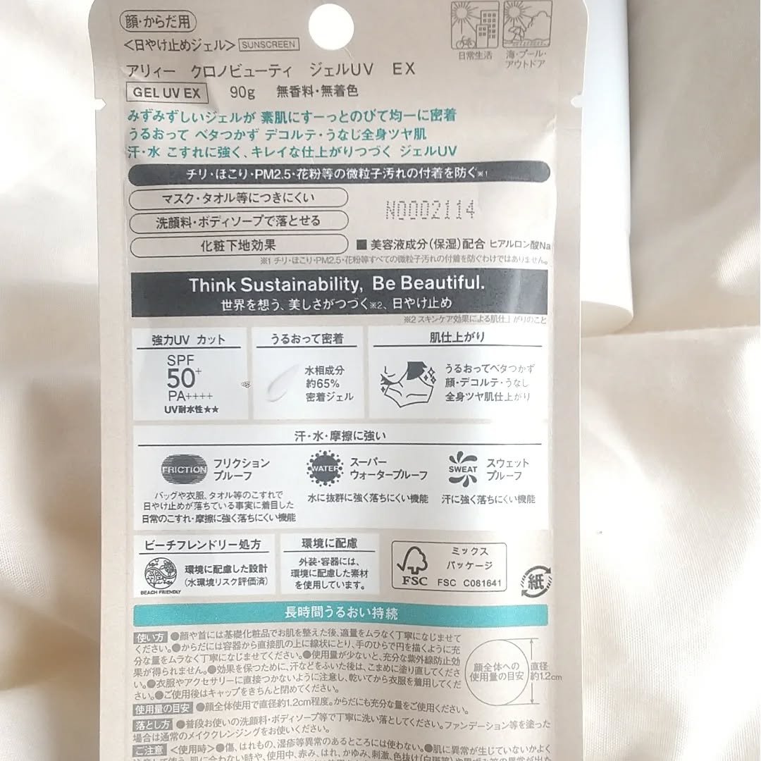 - 世界を想う 美しさつづく*1 日やけ止め おでかけには、落ちにくく、気持ちいい感触がつづく日やけ止めを。 一部の国・地域・ビーチの規制に配慮した設計のビーチフレンドリー処方。 汗・水・こすれにも強く、ベタつかずうるおう仕上がりが持続するジェル UV ●一部の国・地域・ビーチの規制に配慮した設計の「ビーチフレンドリー処方」 ●SPF50+・PA++++ ●汗・水 こすれに強く落ちにくい フリクションプルーフ・スーパーウォータープルーフ ●ベタつきにくい感触がつづく ●うるおい感のある肌仕上がりがつづく ●環境に配慮した素材を使用したパッケージ採用 ●美容液成分(保湿)ヒアルロン酸Na配合 ●顔・からだ用 ●洗顔料・ボディーソープで落とせる ●マスク・タオル等につきにくい ●化粧下地効果 ●無香料・無着色 ●チリ・ほこり・PM2.5・花粉等の微粒子汚れの付着を防ぐ*2 *1 スキンケア効果またはメイクアップ効果による肌仕上がりのこと *2 チリ・ほこり・PM2.5・花粉等すべての微粒子汚れの付着を防ぐわけではありません <限定セットA:セット内容> ・アリィー クロノビューティ ジェルUV EX 90g ・アリィー クロノビューティ ラスティングプライマーUV 5g ※セット商品の成分につきましては各商品ページでご確認ください。