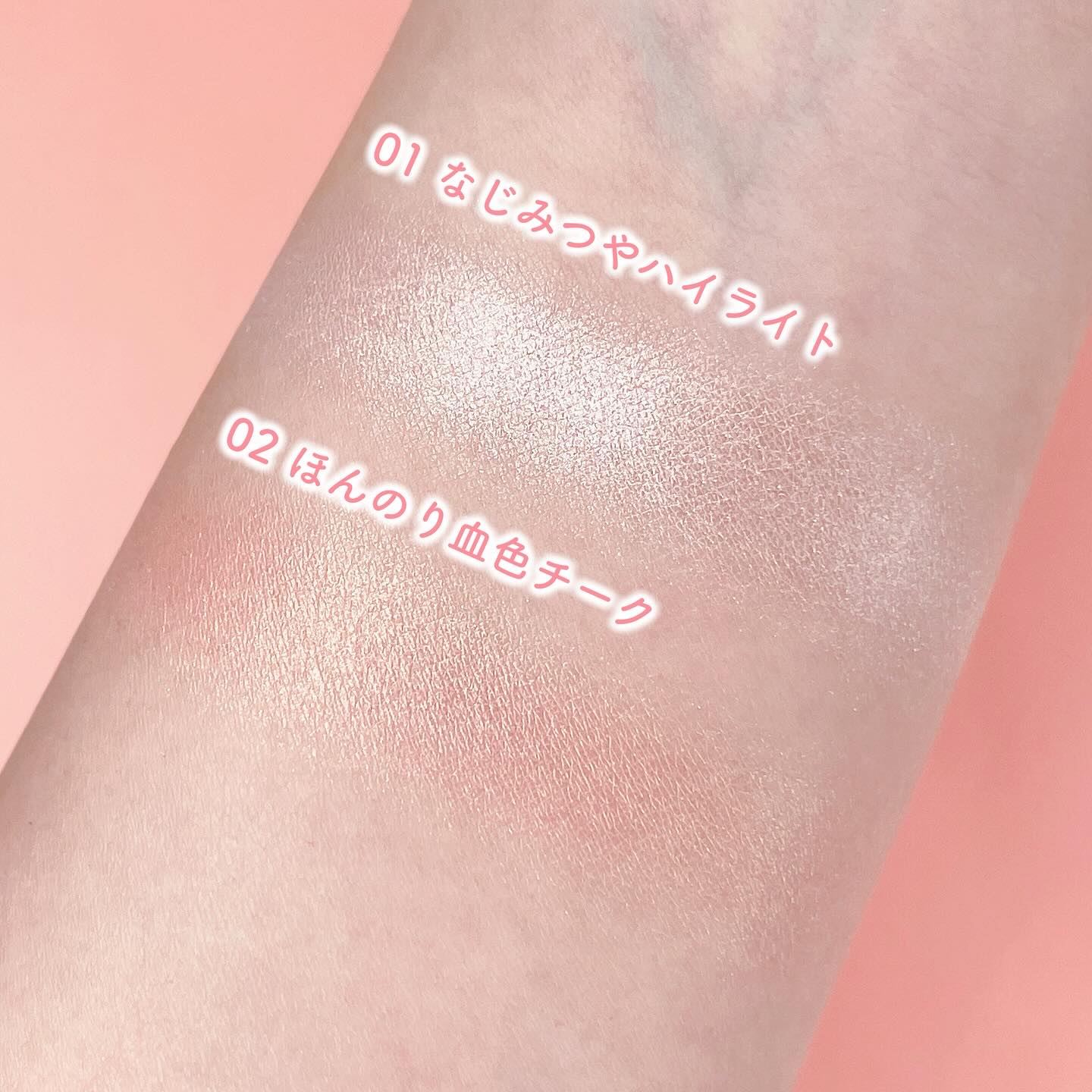 エテュセのフェイスカラー、待ってましたー!! もうね、ほんとうに使用感がよかった✨ うるおいが長時間続くスキンケア仕立てでテクスチャーだけでなく肌もしっとりが続く🫧 01 なじみつやハイライト 繊細な輝きでうるおったツヤ肌を演出 白浮しないピンクベージュ♡