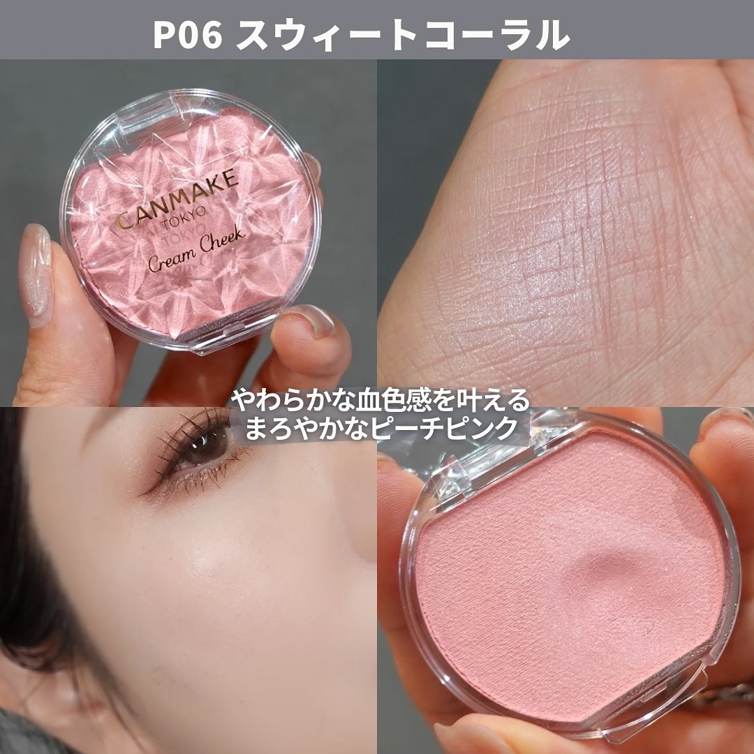 ✼••┈┈••✼••┈┈••✼••キャンメイククリームチーク(パールタイプ✼••┈┈••✼••┈┈••✼••うるっと艶やかな仕上がりになるむにゅと質感の生チークP06スウィートコーラルはやわらかい血色感を叶えるまろやかなピーチピンクふんわり肌...